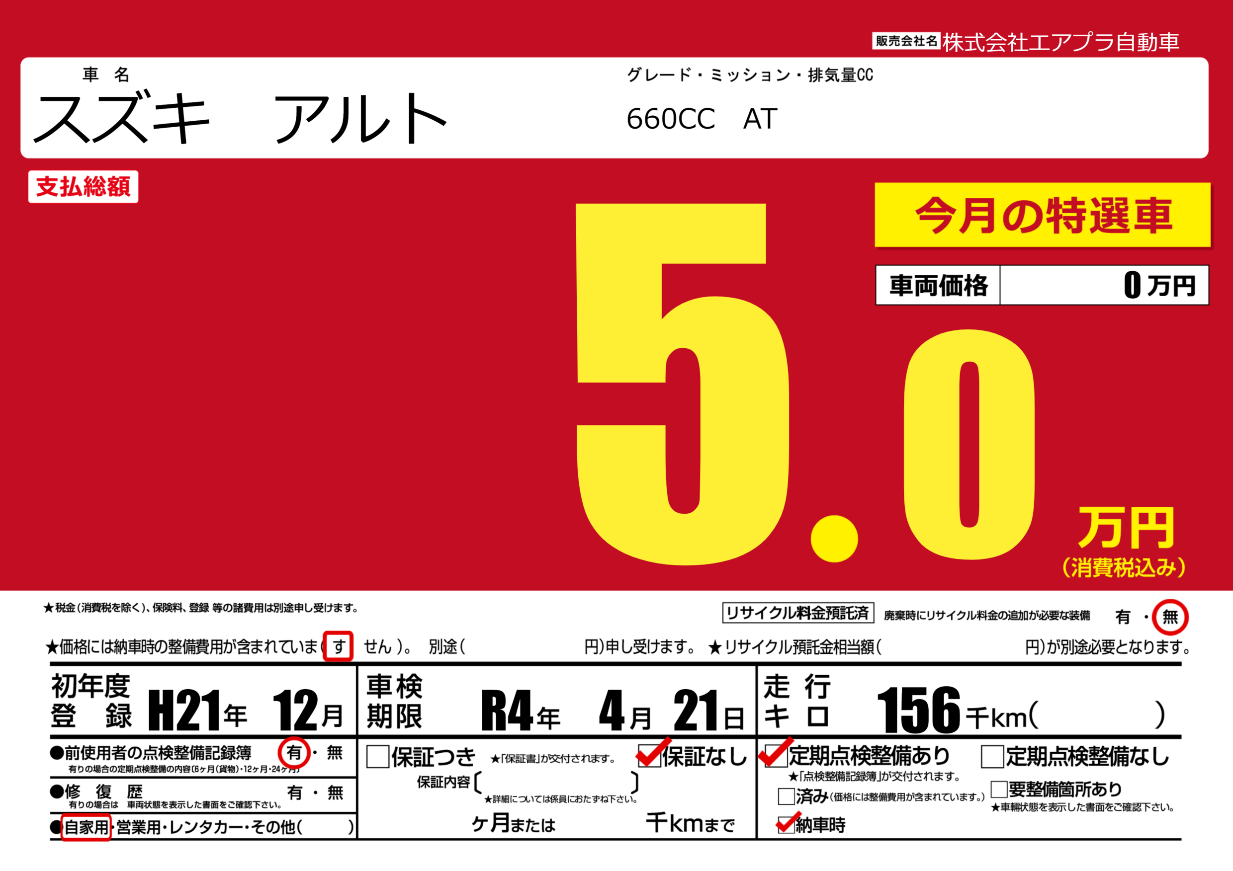 | 車名 | スズキ アルト | グレード ミッション 排気量 |