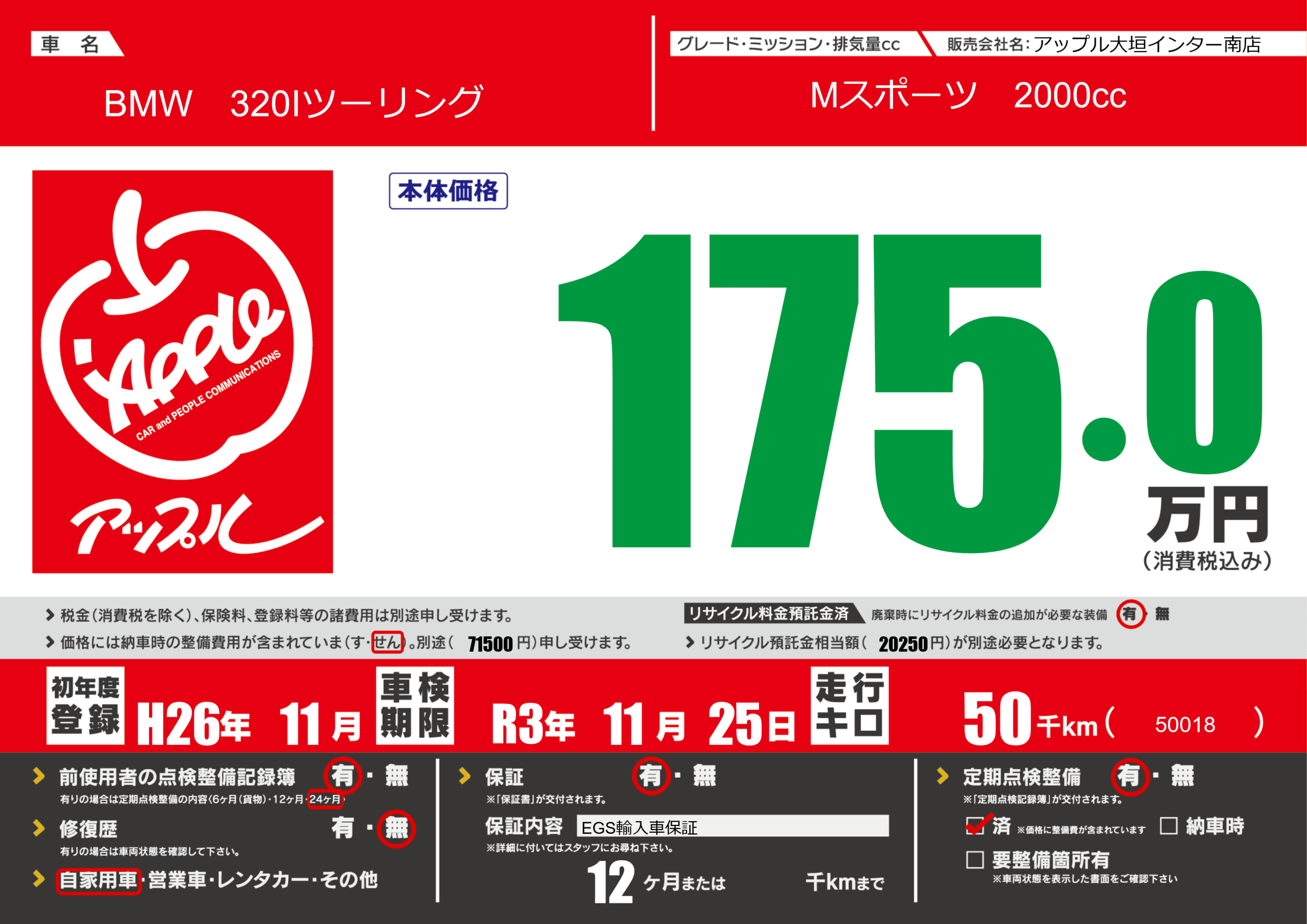 | 車名 | BMW 320Iツーリング | グレード ミッション 排気量 |