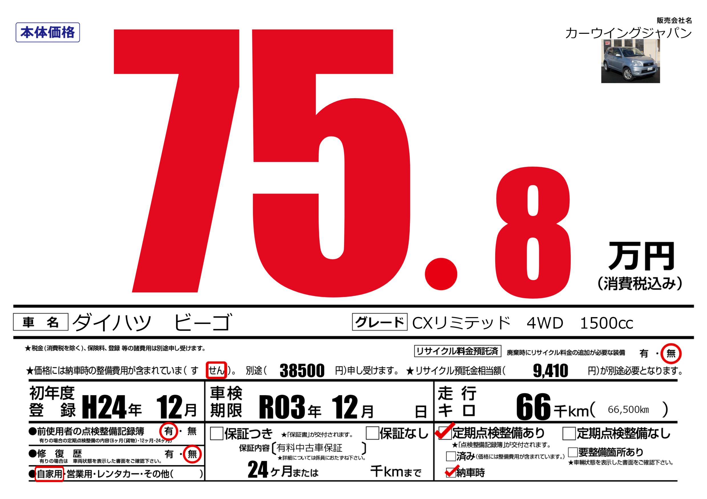 | 車検制限 | R03年 12月 - 日 | ||