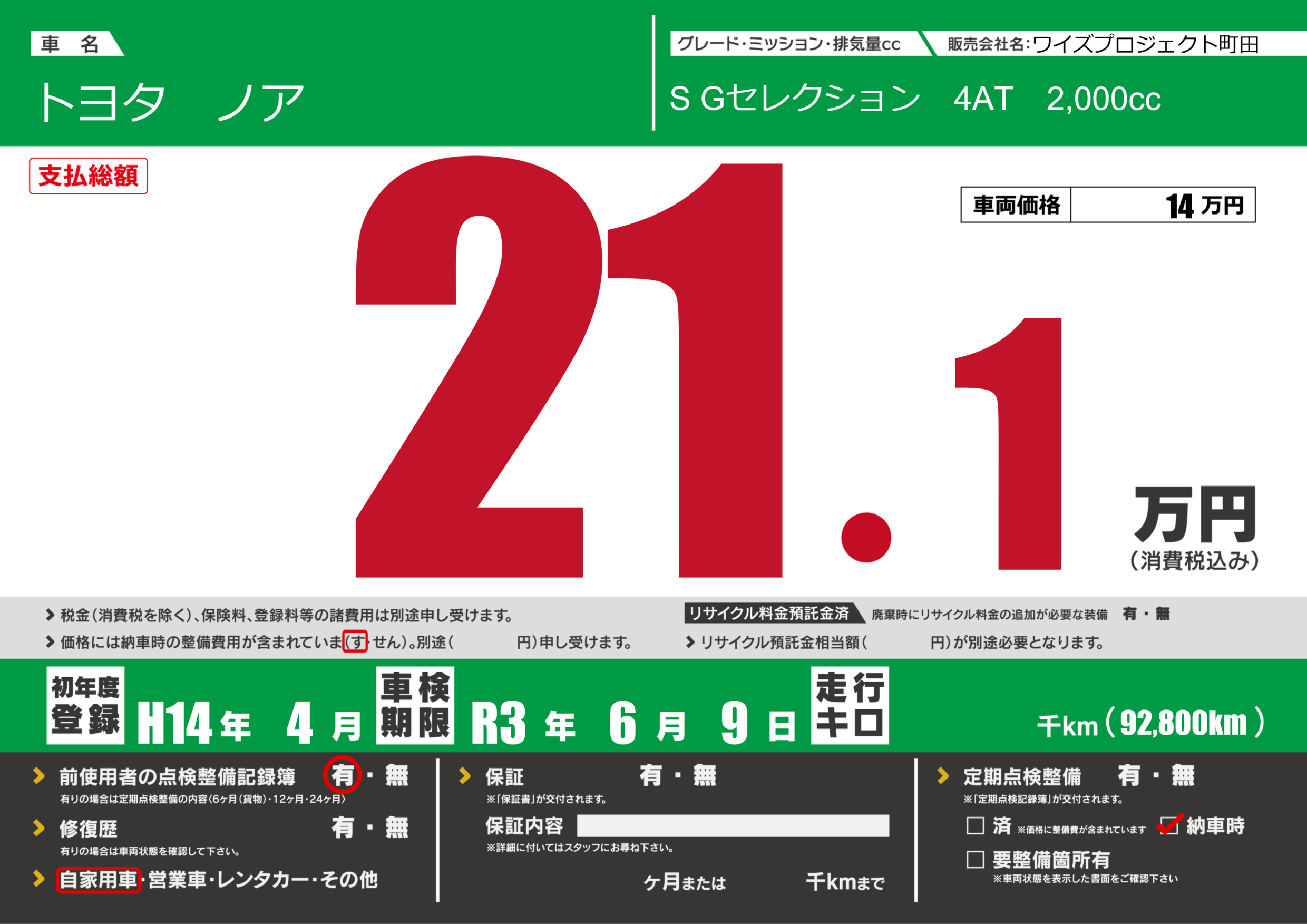 | 車名 | トヨタ ノア | グレード ミッション 排気量 |