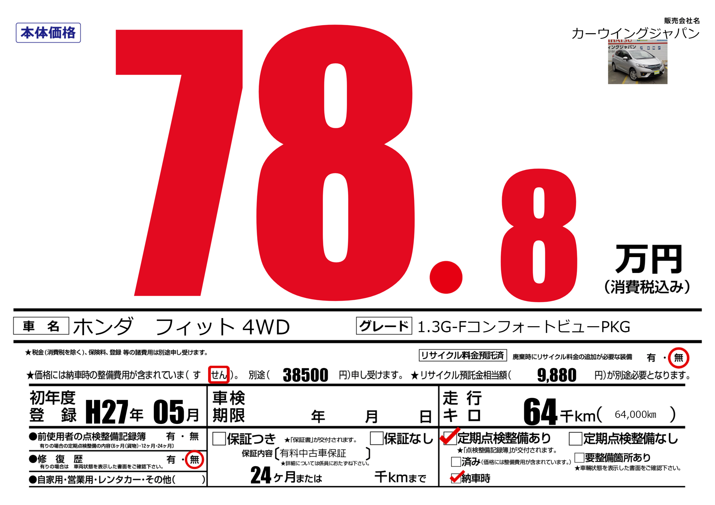 | 車名 | ホンダ フィット 4WD | グレード ミッション 排気量 |