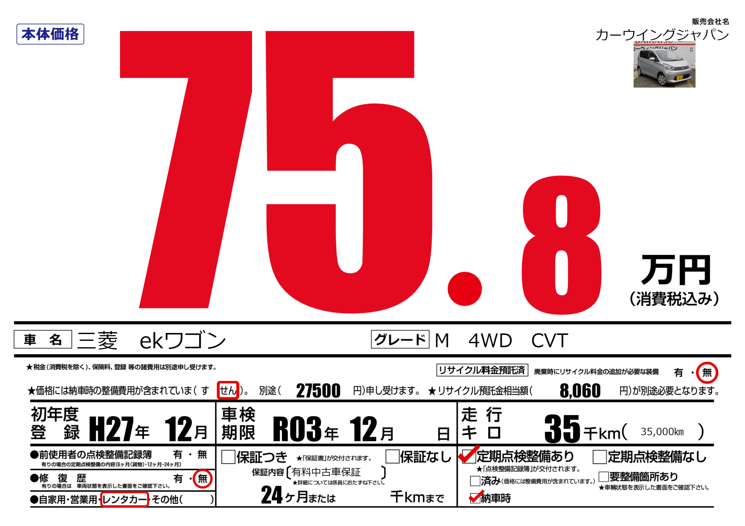 | 車検制限 | R03年 12月 - 日 | ||