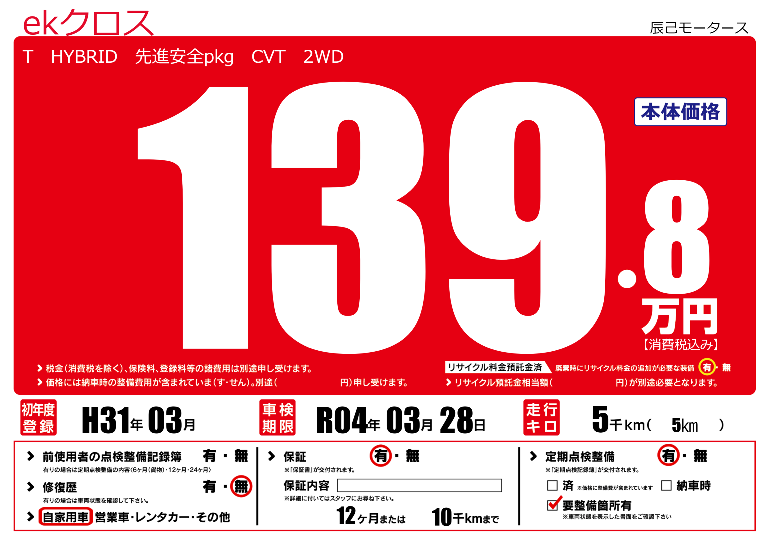 | 定期点検整備 | 定期点検整備あり 納車時あり | ||