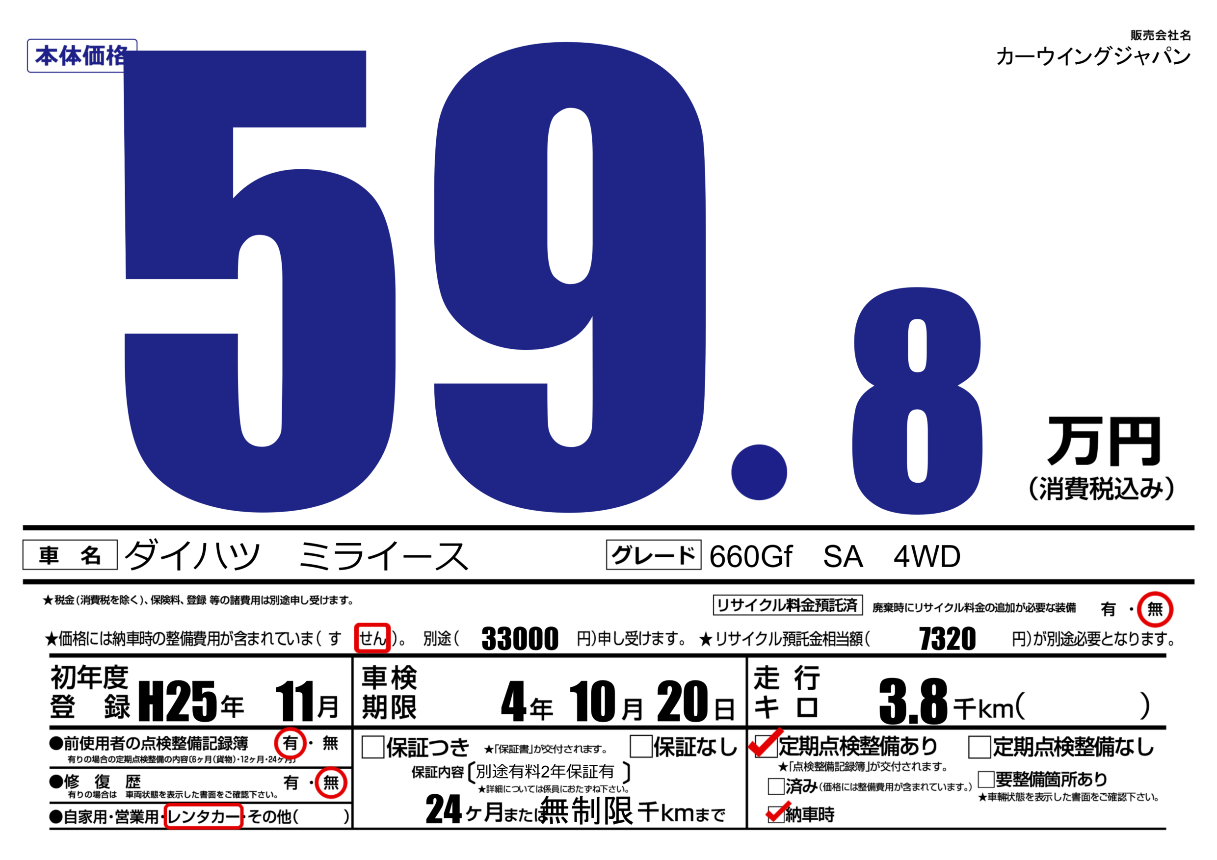 | 定期点検整備 | 定期点検整備あり 納車時あり | ||