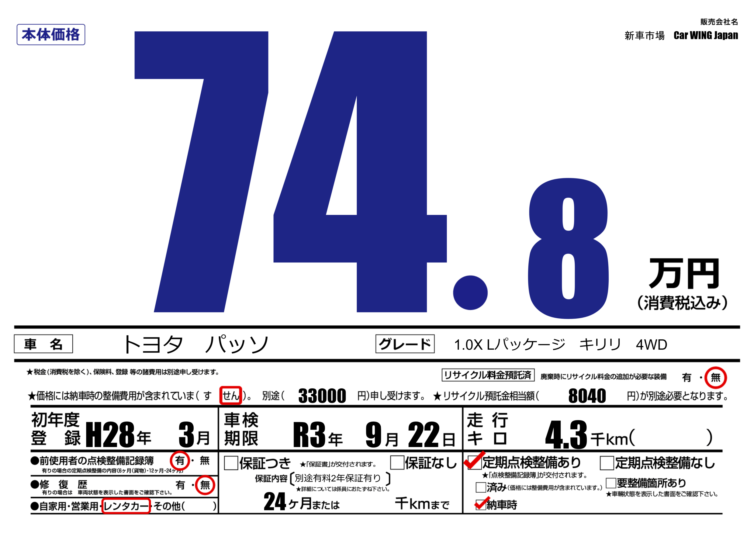 | 車名 | トヨタ パッソ | グレード ミッション 排気量 |