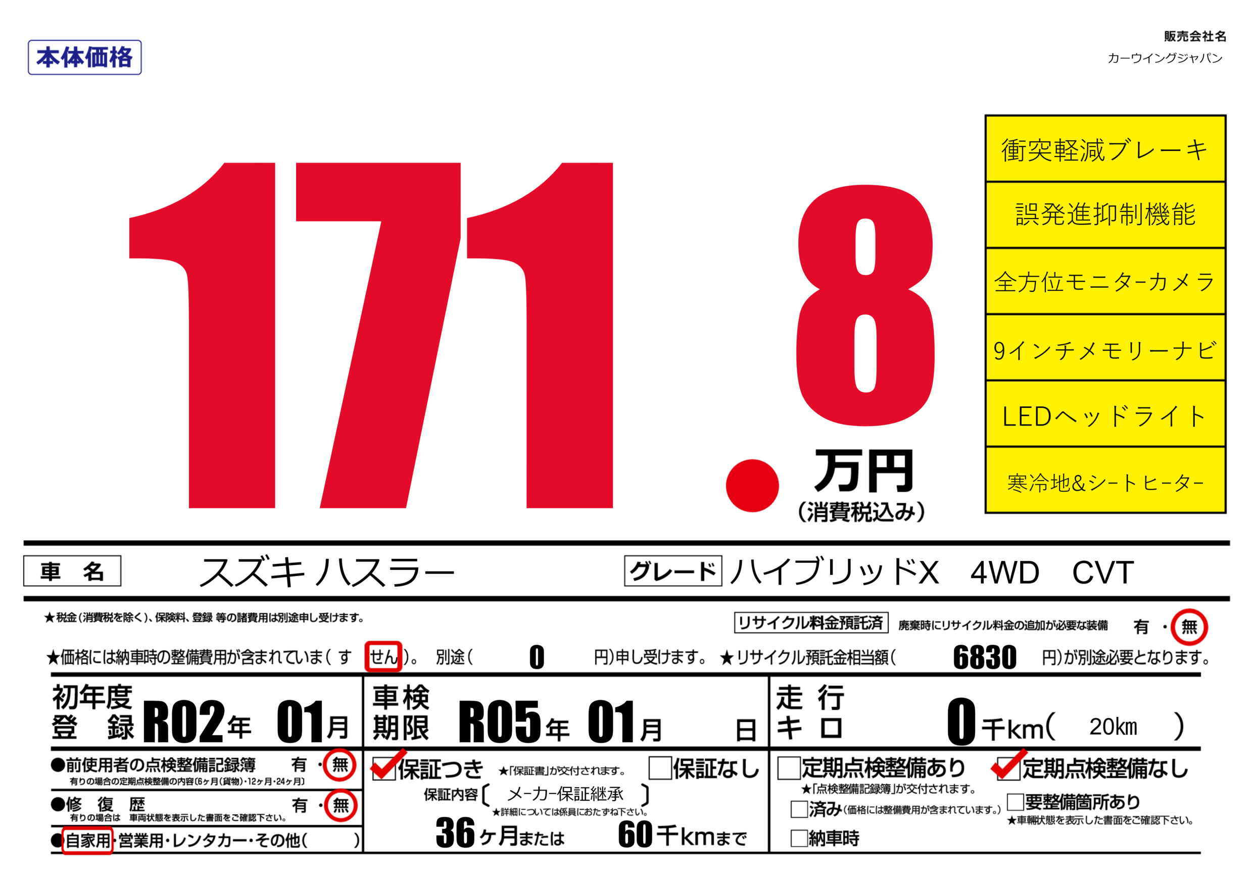 | 車名 | スズキ ハスラー | グレード ミッション 排気量 |