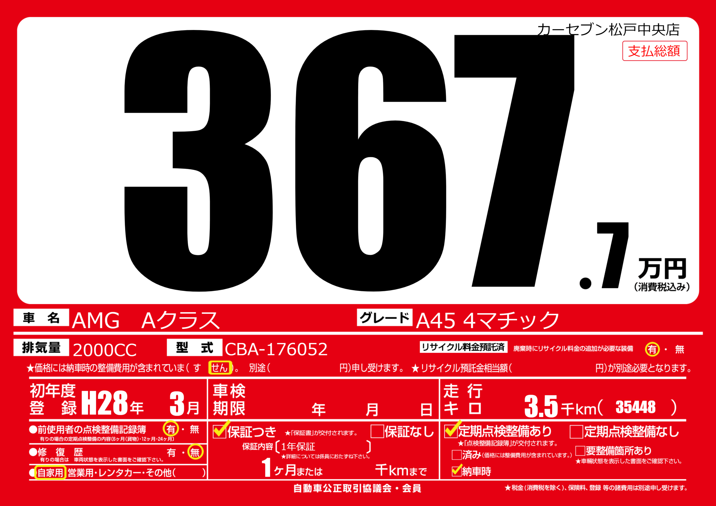| 車名 | AMG Aクラス | グレード ミッション 排気量 |