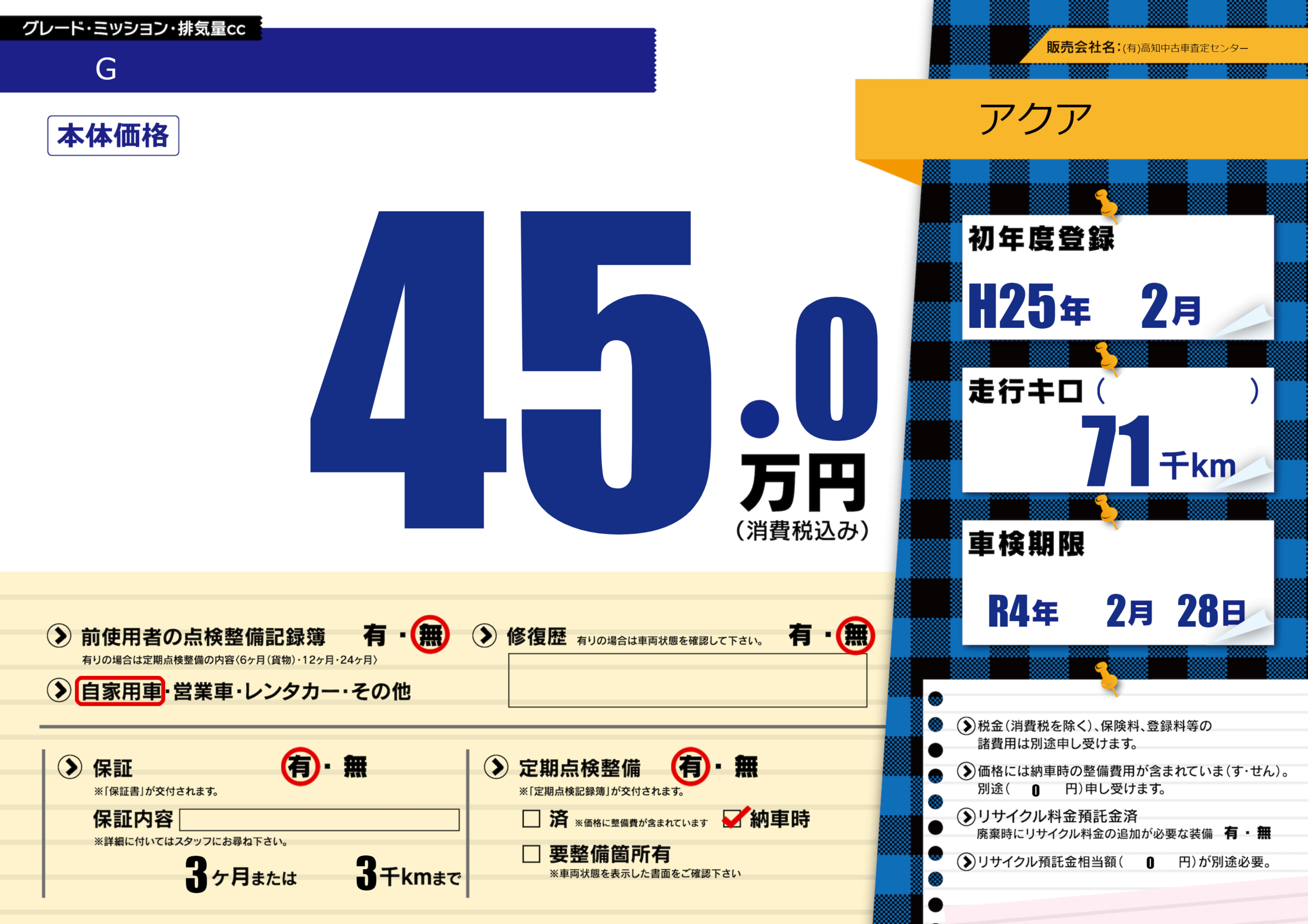 | 定期点検整備 | 定期点検整備あり 納車時あり | ||