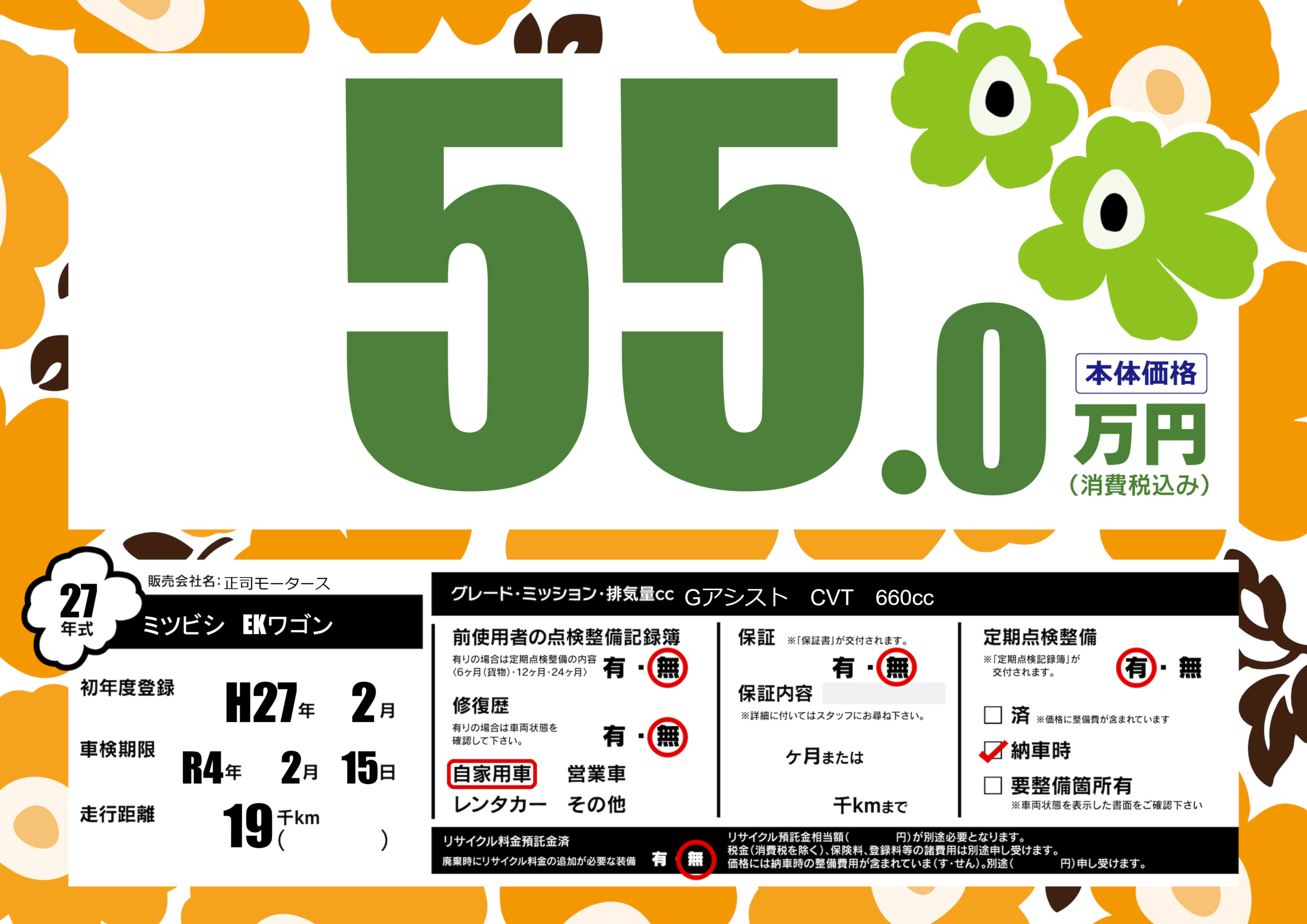 | 車名 | ミツビシ EKワゴン | グレード ミッション 排気量 |