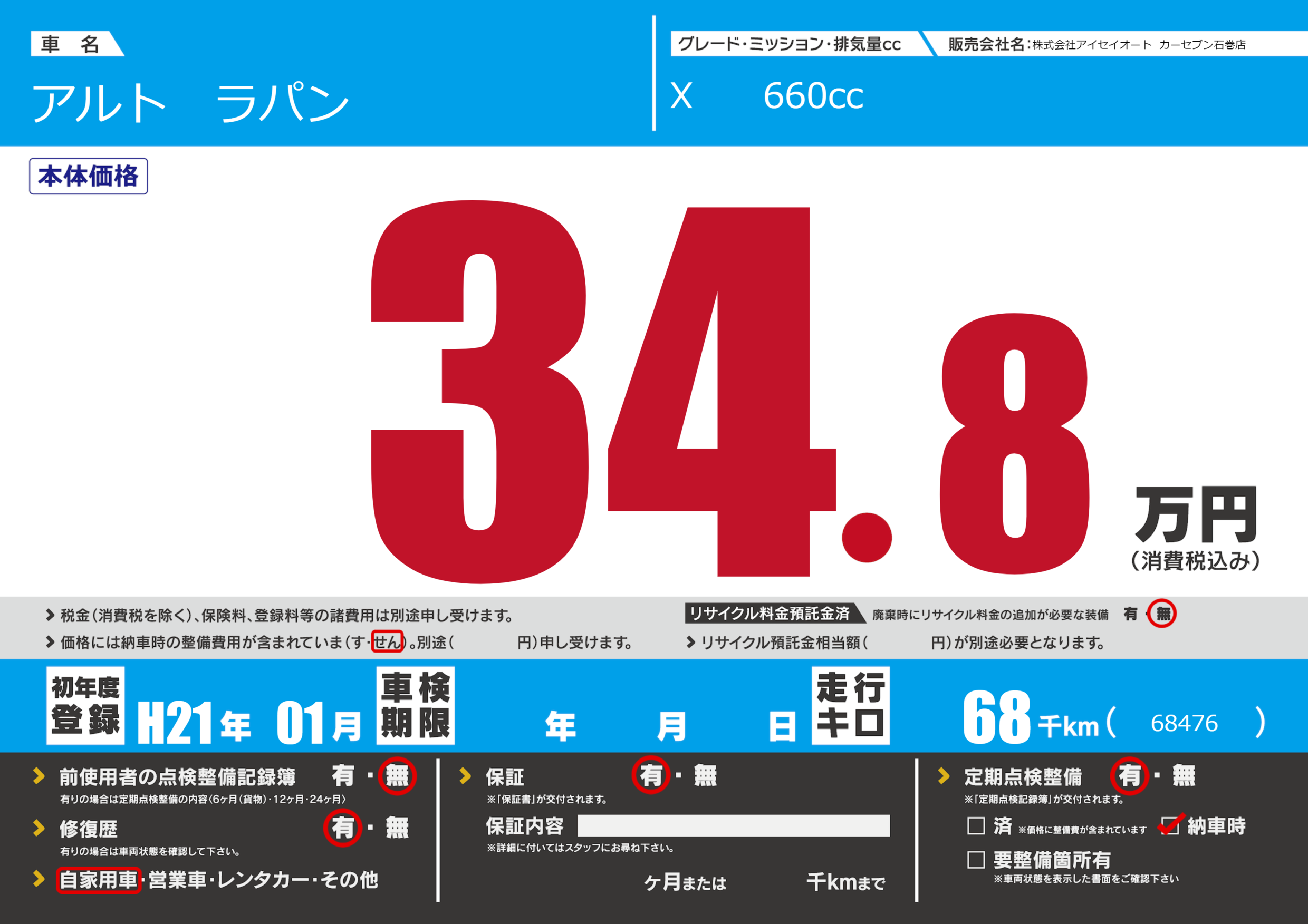 | 車名 | アルト ラパン | グレード ミッション 排気量 |