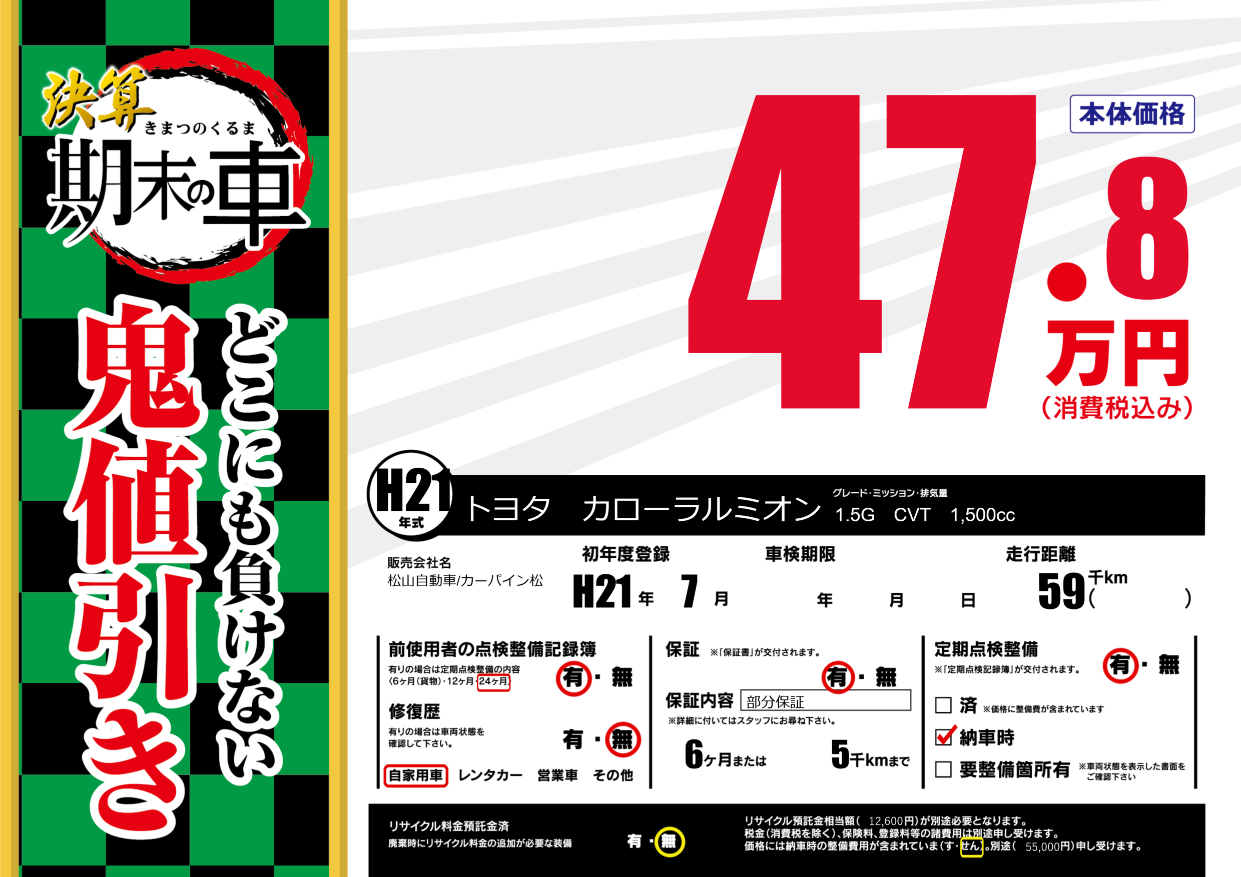 保証付き 保証内容(部分保証) 6ヶ月または(5)千kmまで |