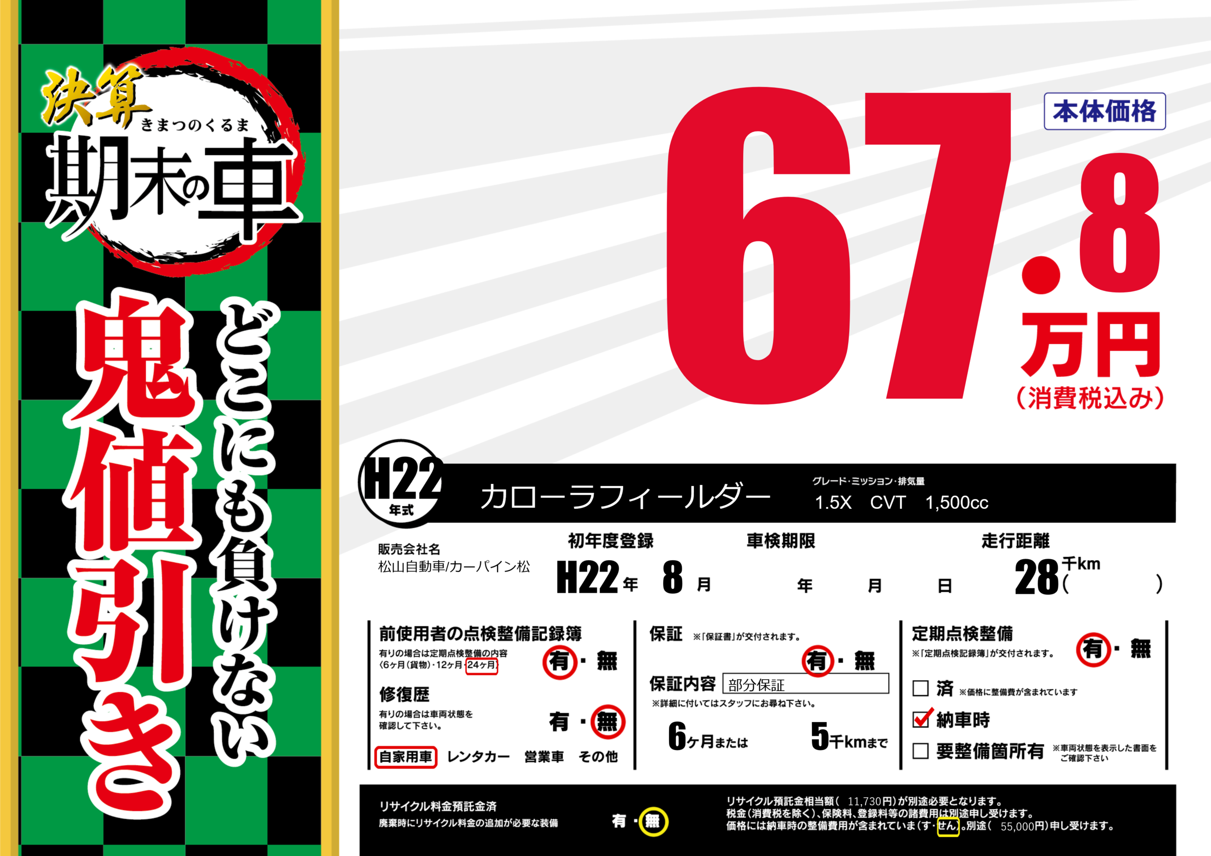保証付き 保証内容(部分保証) 6ヶ月または(5)千kmまで |