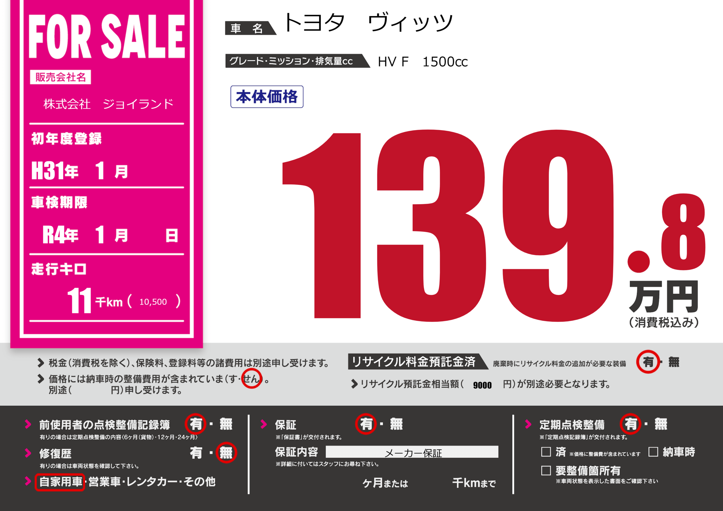 なし | 車検制限 | R4年1月---月 |