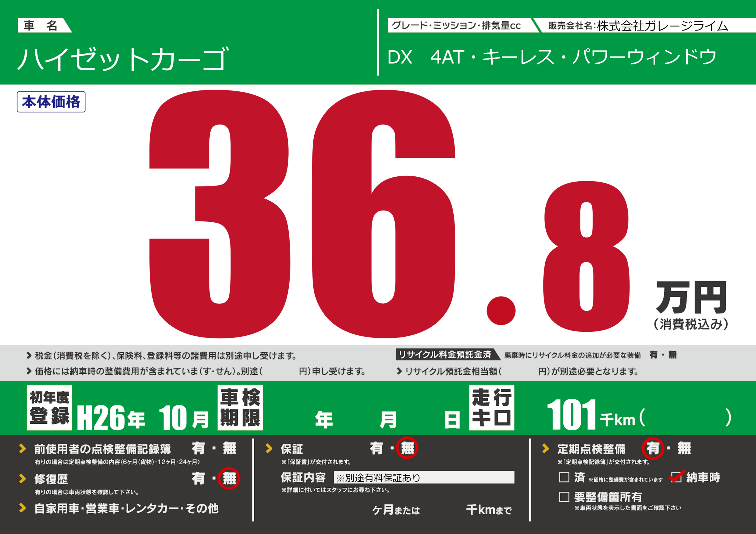 | 車名 | ハイゼットカーゴ | グレード ミッション 排気量 |