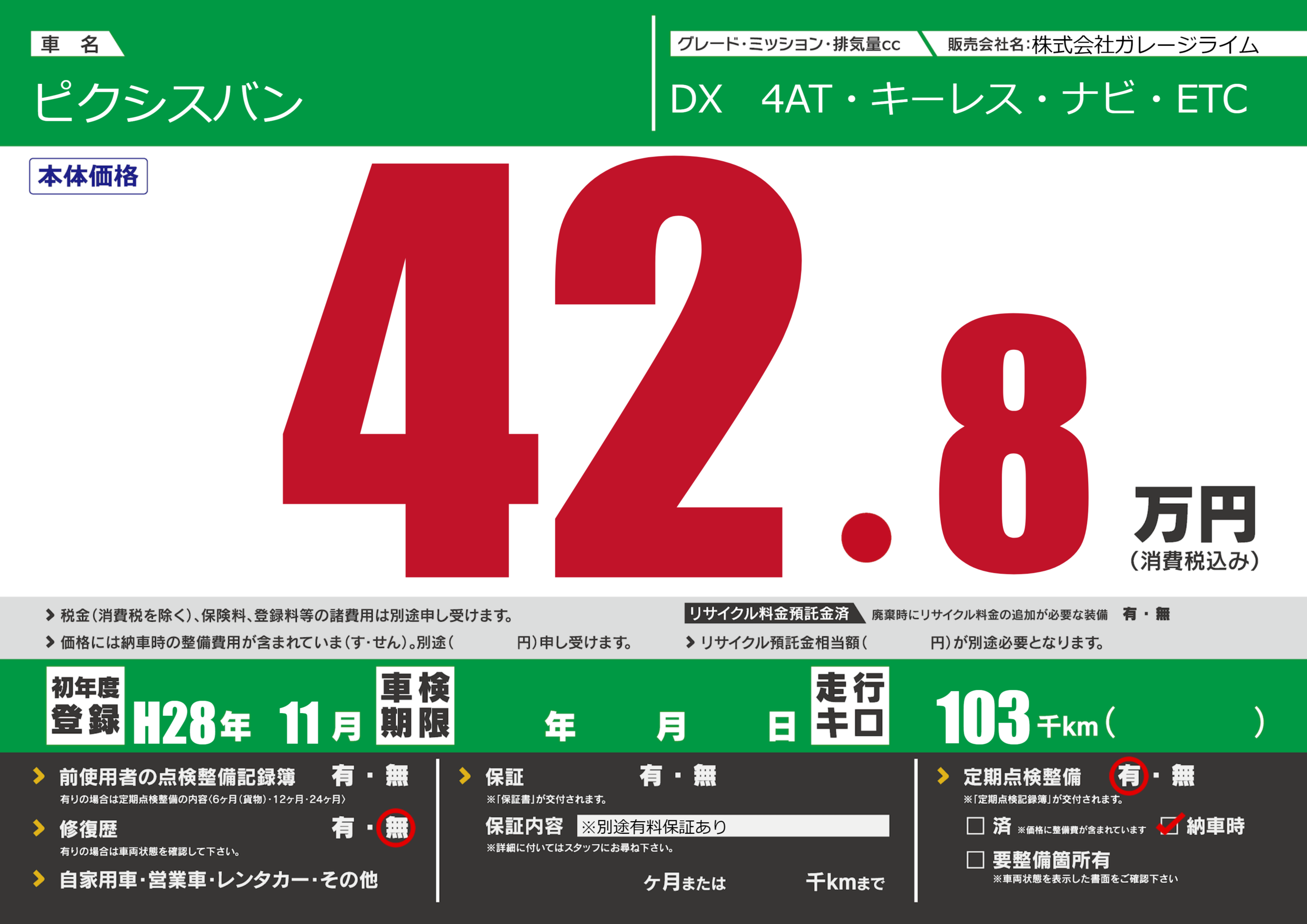 | 定期点検整備 | 定期点検整備あり 納車時あり | ||