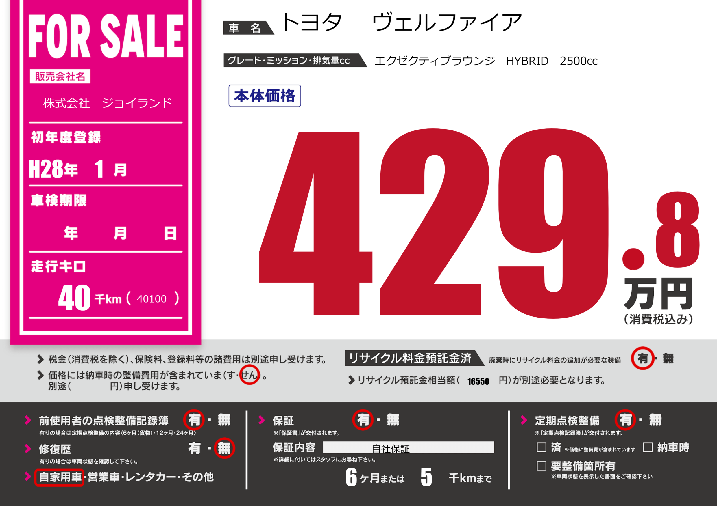 | 車名 | トヨタ ヴェルファイア | グレード ミッション 排気量 |
