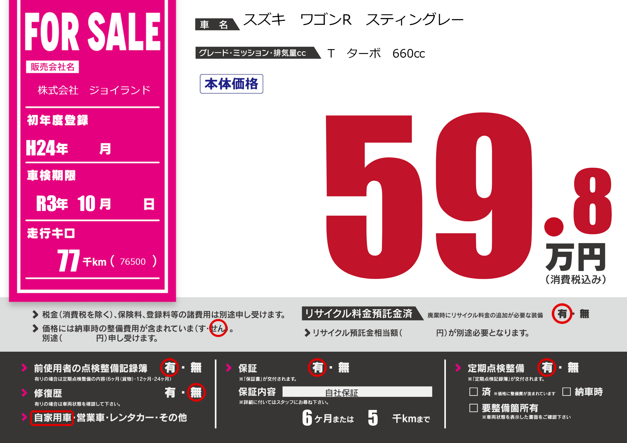 なし | 車検制限 | R3年10月---月 |