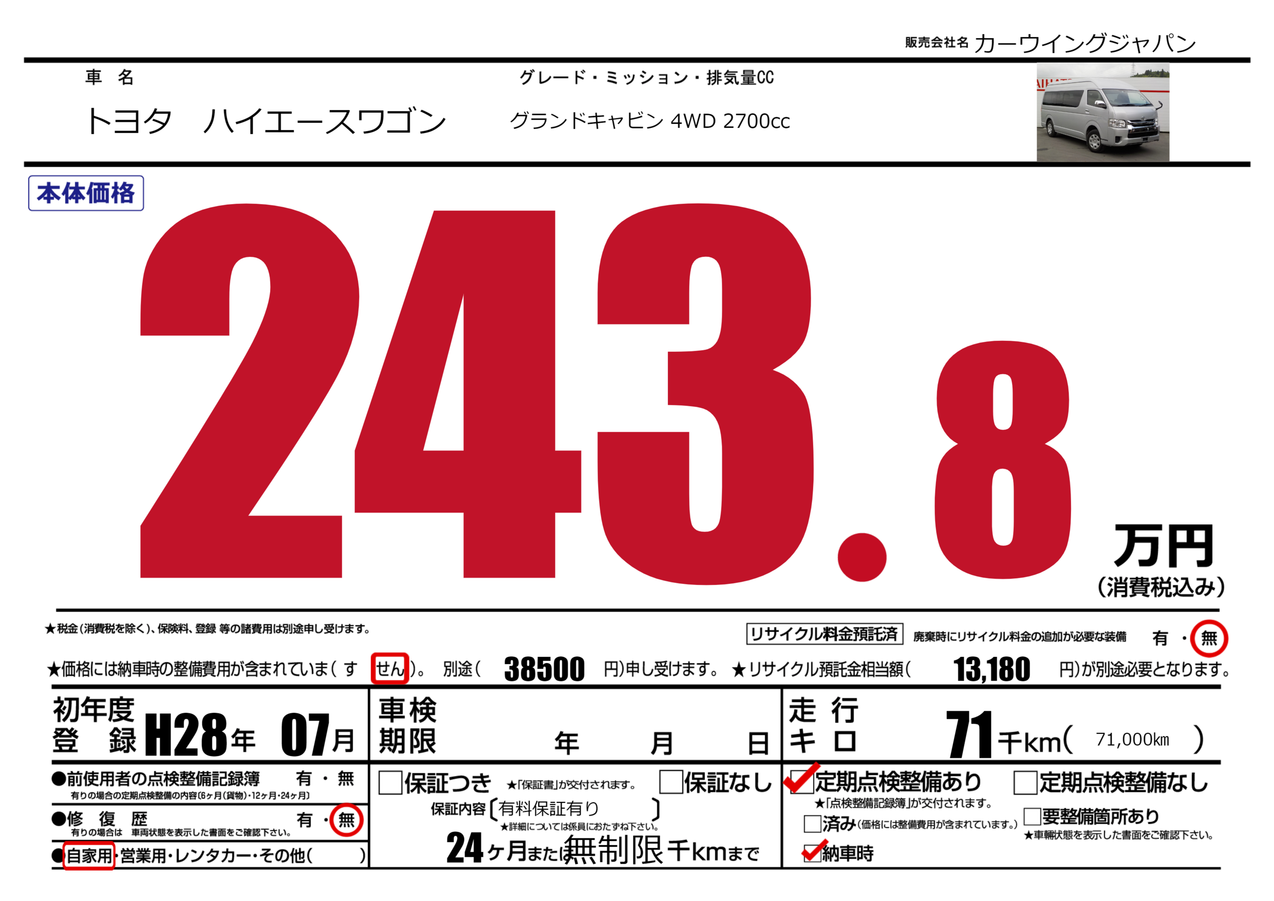 | 車名 | トヨタ ハイエースワゴン | グレード ミッション 排気量 |