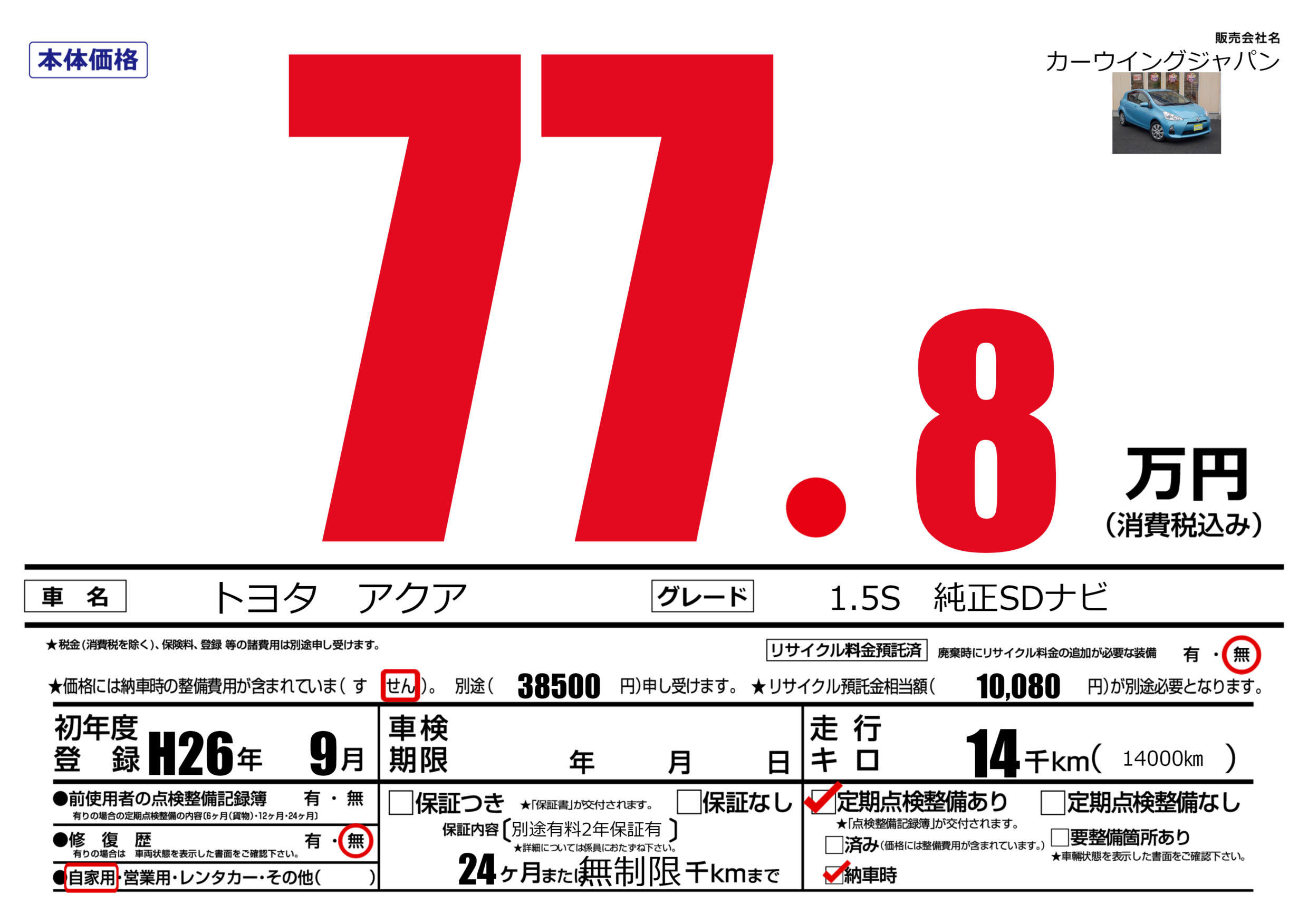 | 定期点検整備 | 定期点検整備あり 納車時あり | ||