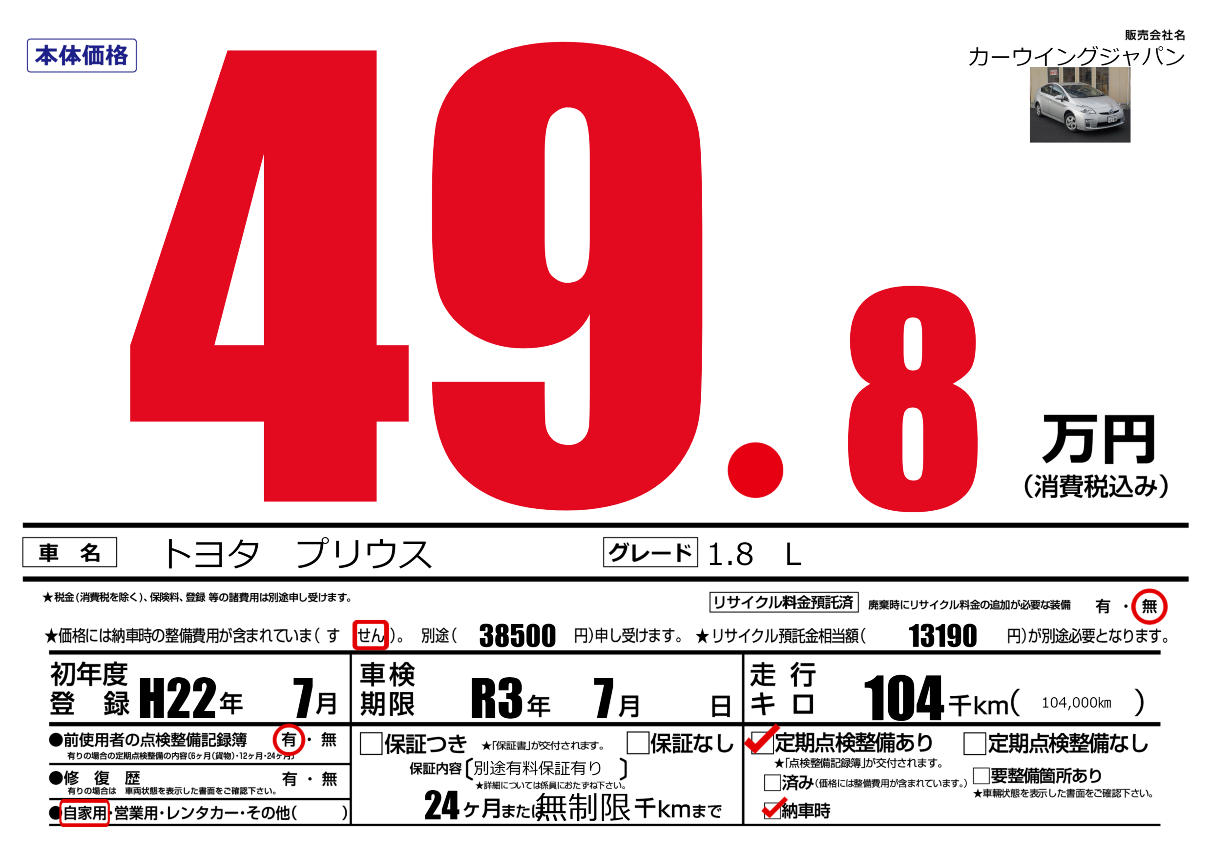 | 車名 | トヨタ プリウス | グレード ミッション 排気量 |