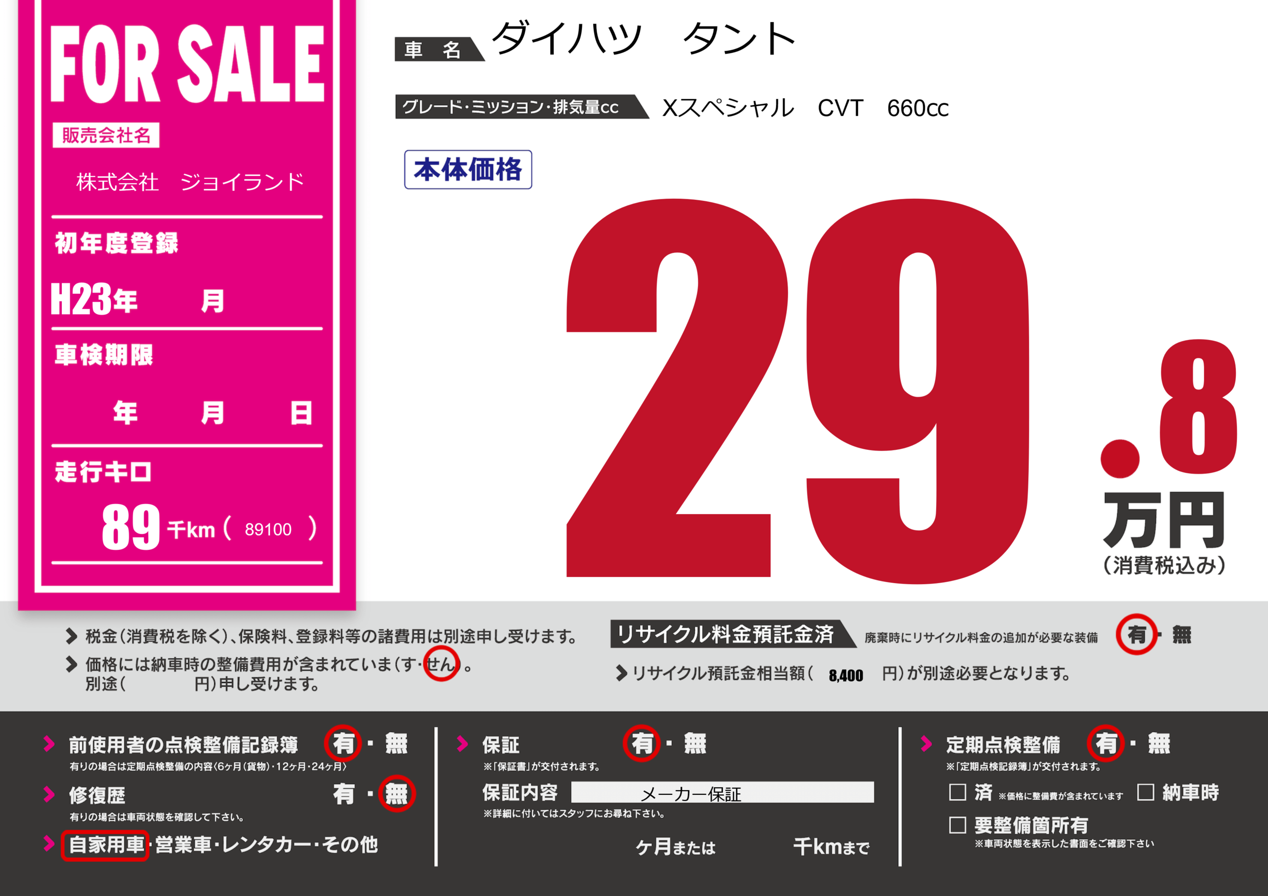 | 車名 | ダイハツ タント | グレード ミッション 排気量 |