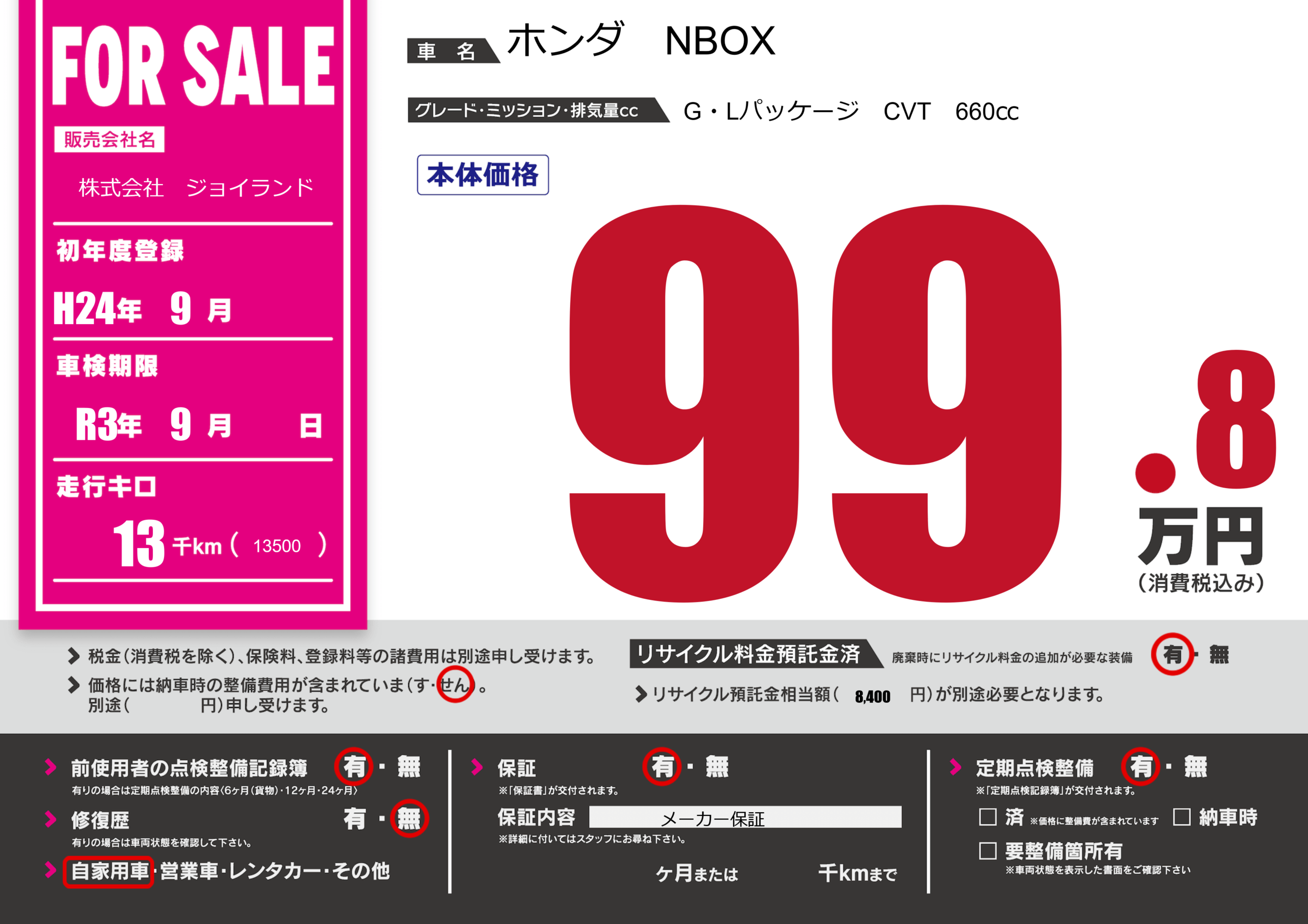 | 車名 | ホンダ NBOX | グレード ミッション 排気量 |