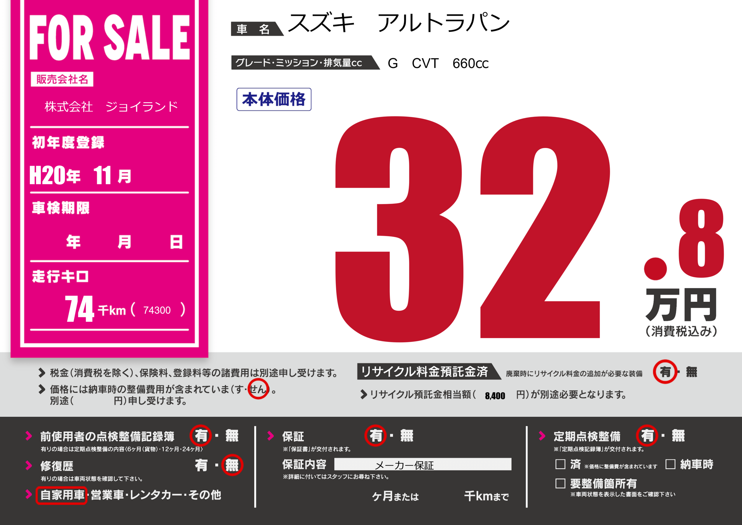保証付き 保証内容( メーカー保証) ---ヶ月または()千kmまで |