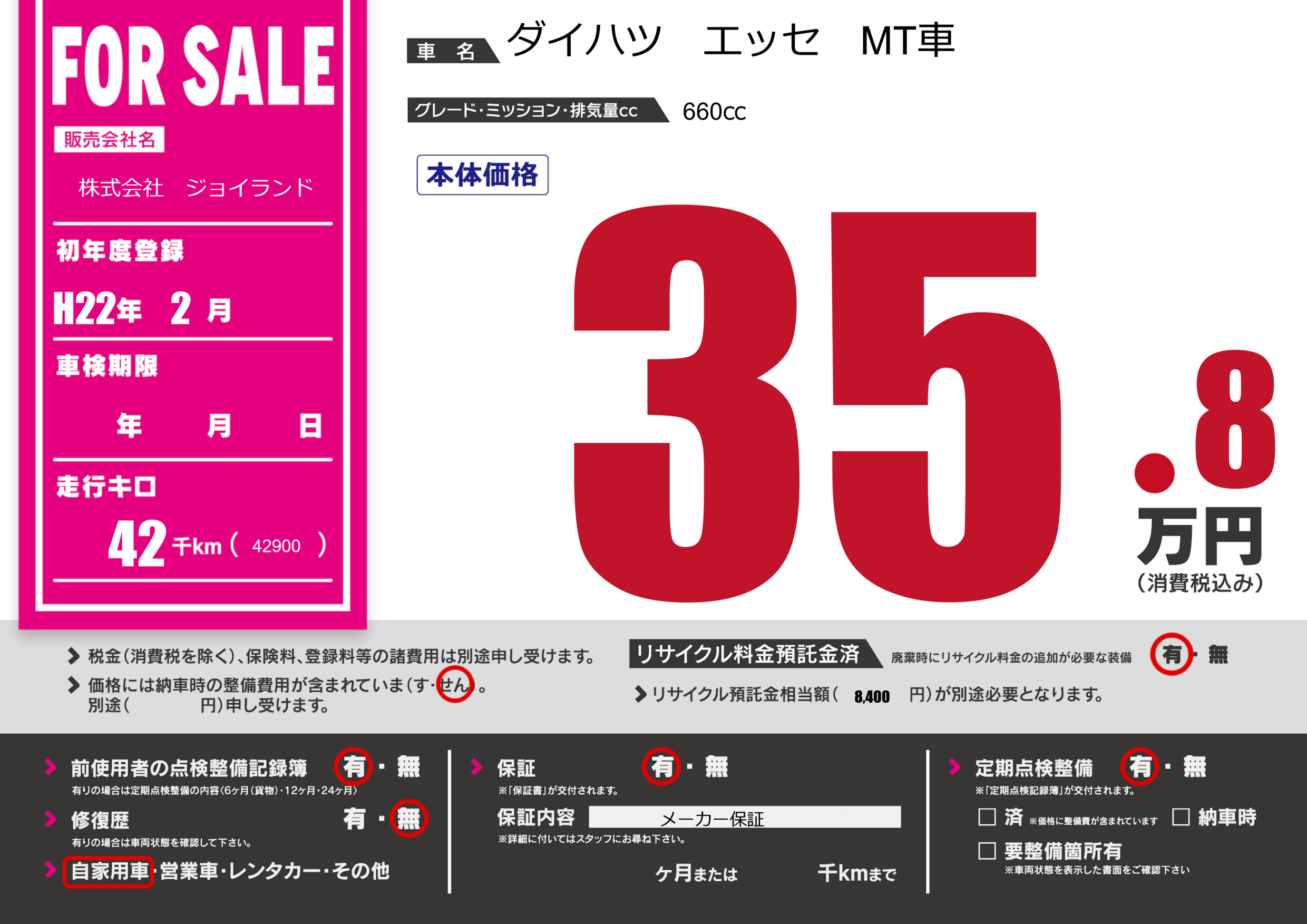 保証付き 保証内容( メーカー保証) ---ヶ月または()千kmまで |