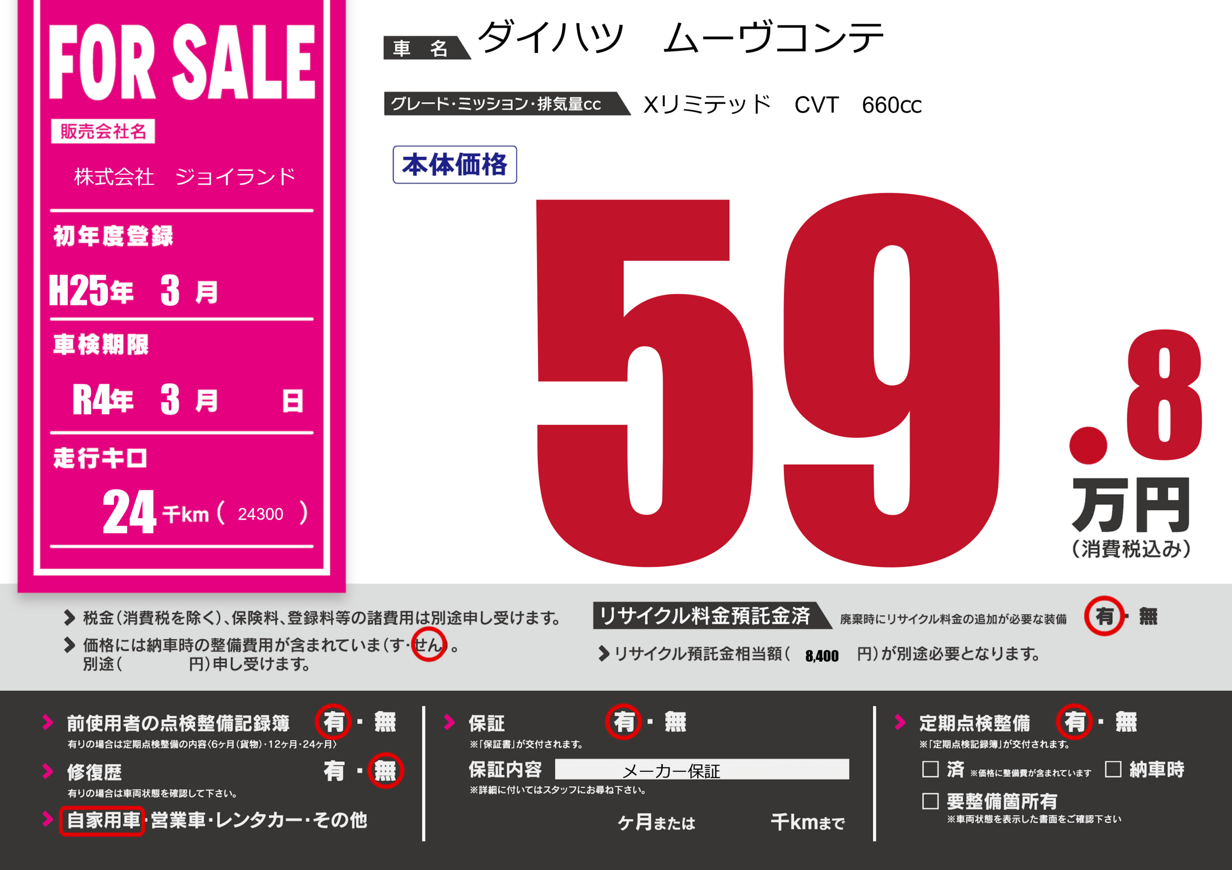 なし | 車検制限 | R4年3月---月 |
