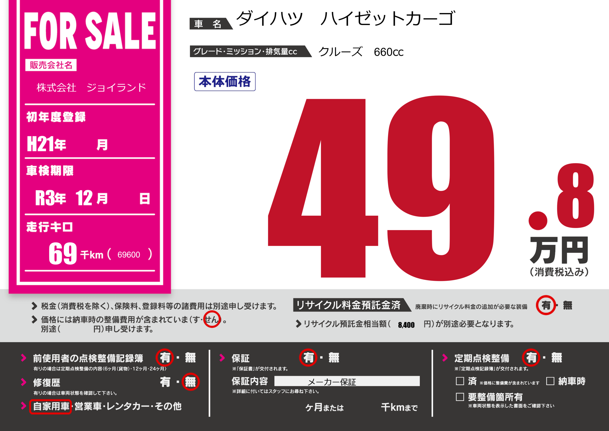 | 車名 | ダイハツ ハイゼットカーゴ | グレード ミッション 排気量 |