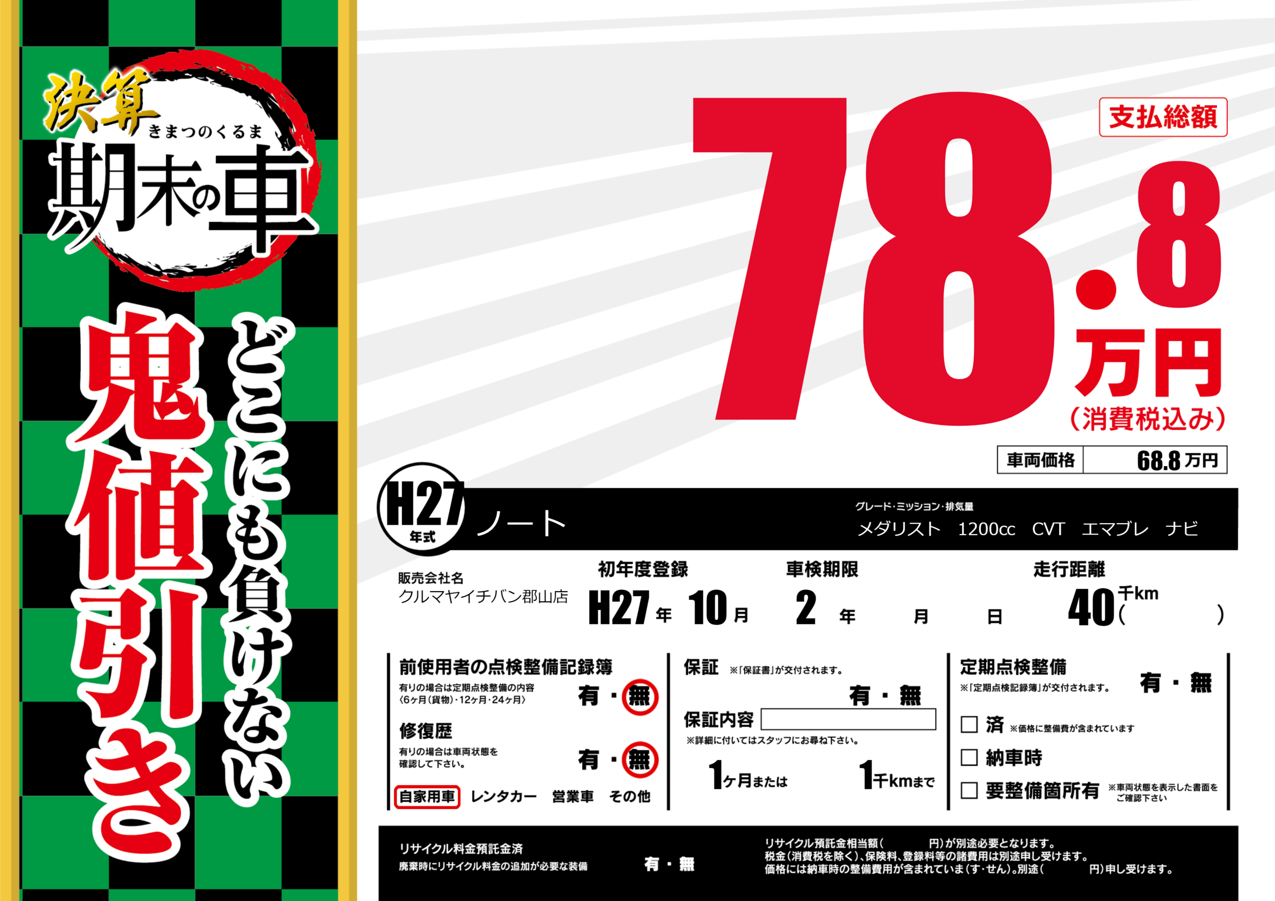 | 走行キロ | 4万km | 初年度登録 | H27年10月 |