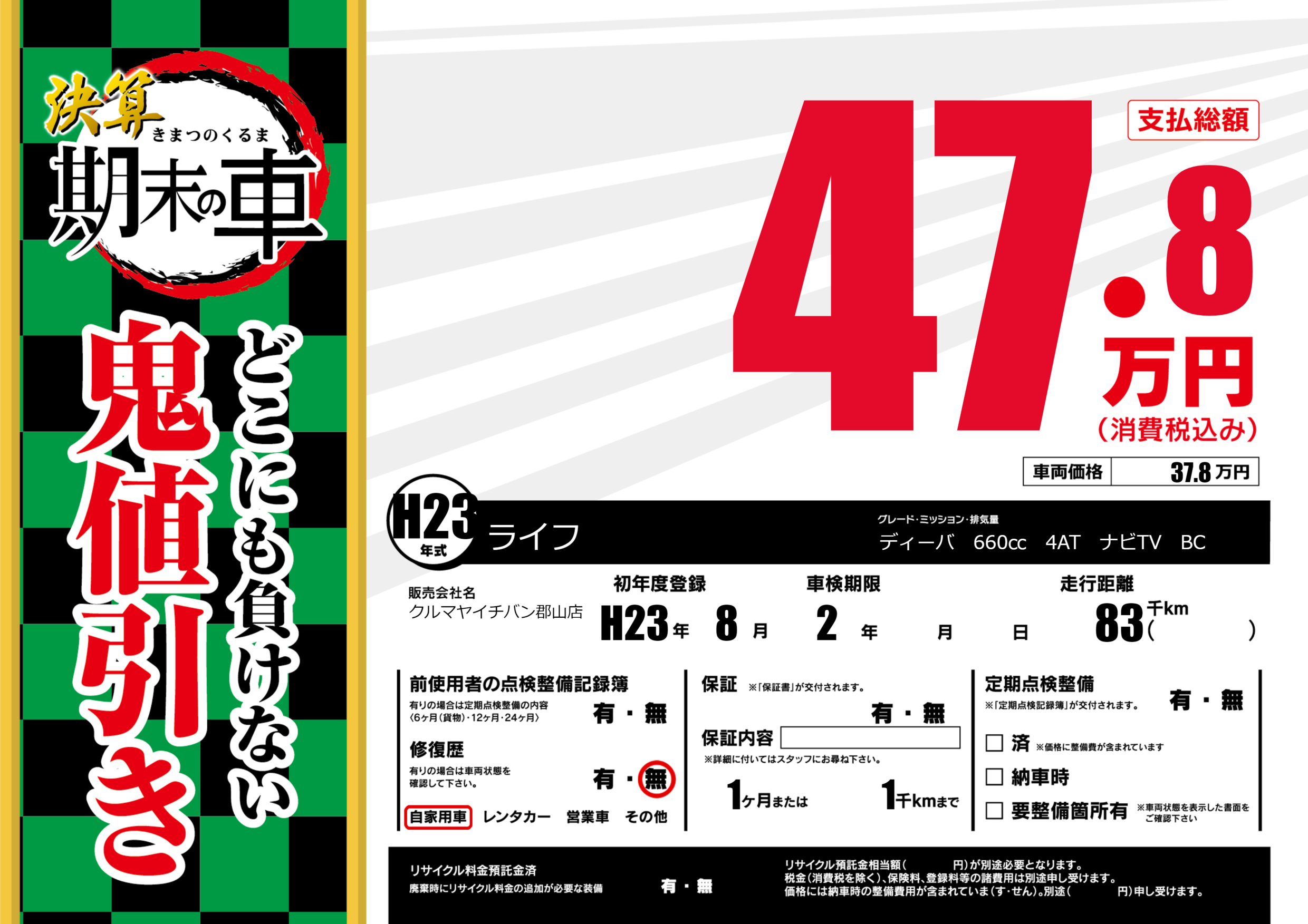 | 走行キロ | 8.3万km | 初年度登録 | H23年8月 |