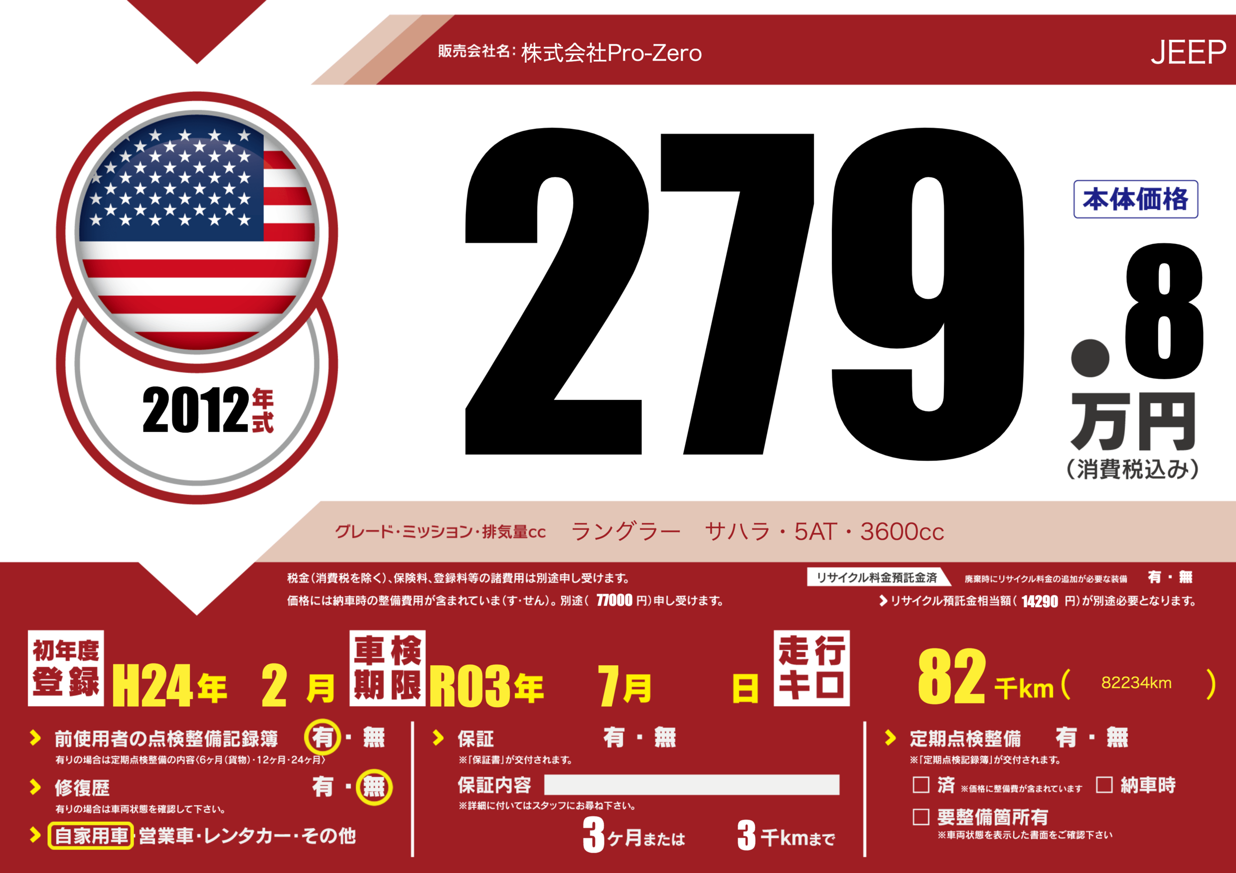 | 車名 | JEEP | グレード ミッション 排気量 |