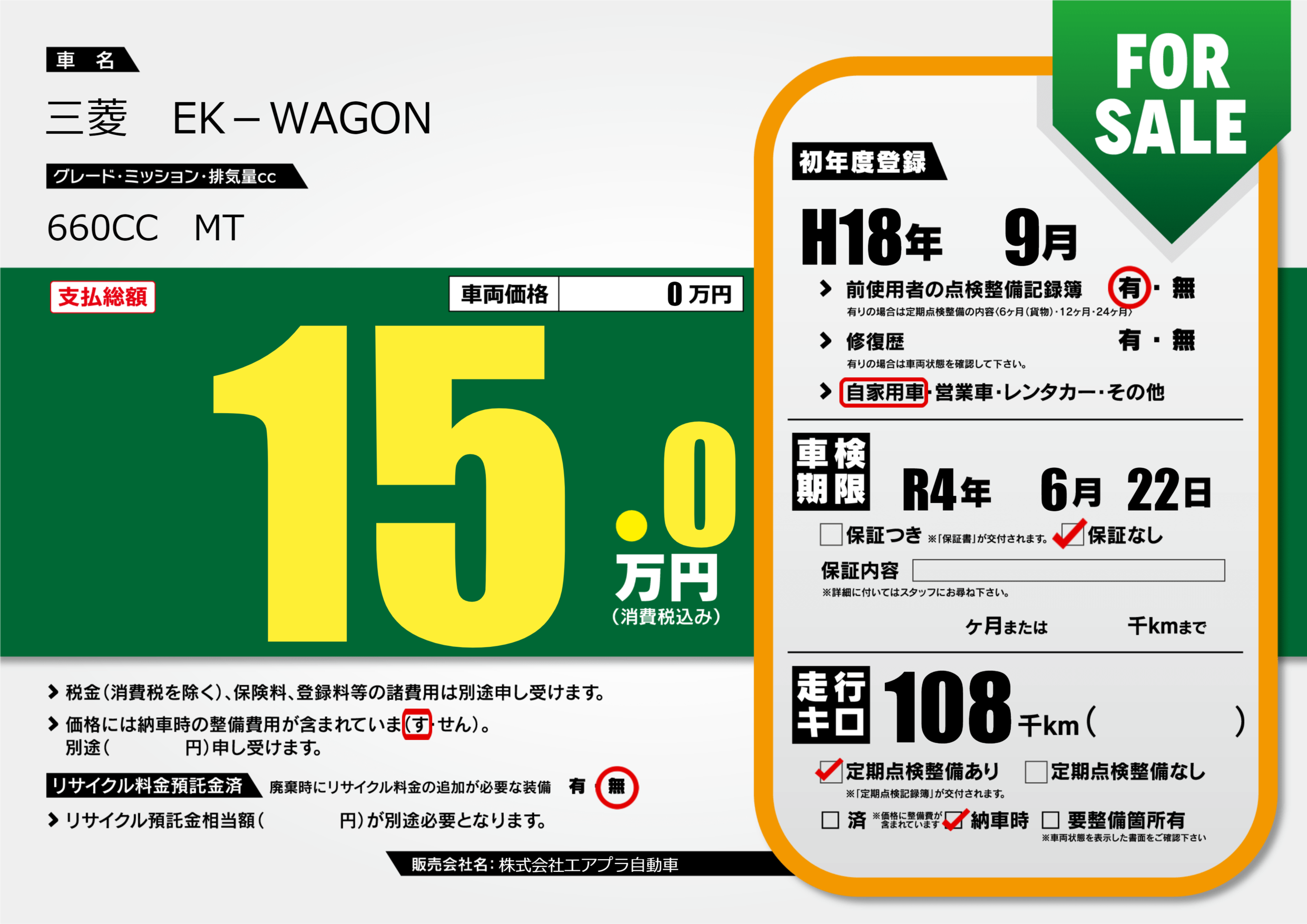 | 車名 | 三菱 EK-WAGON | グレード ミッション 排気量 |
