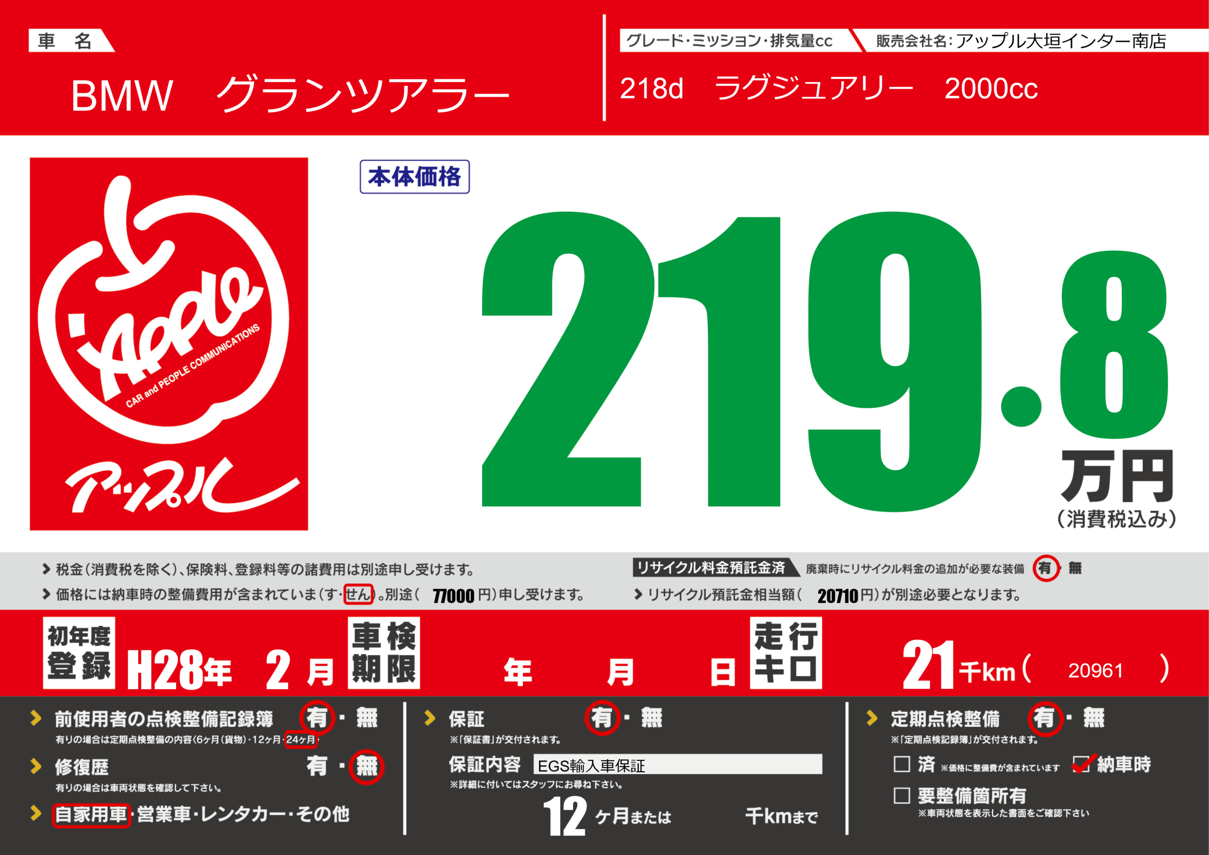 | 定期点検整備 | 定期点検整備あり 納車時あり | ||