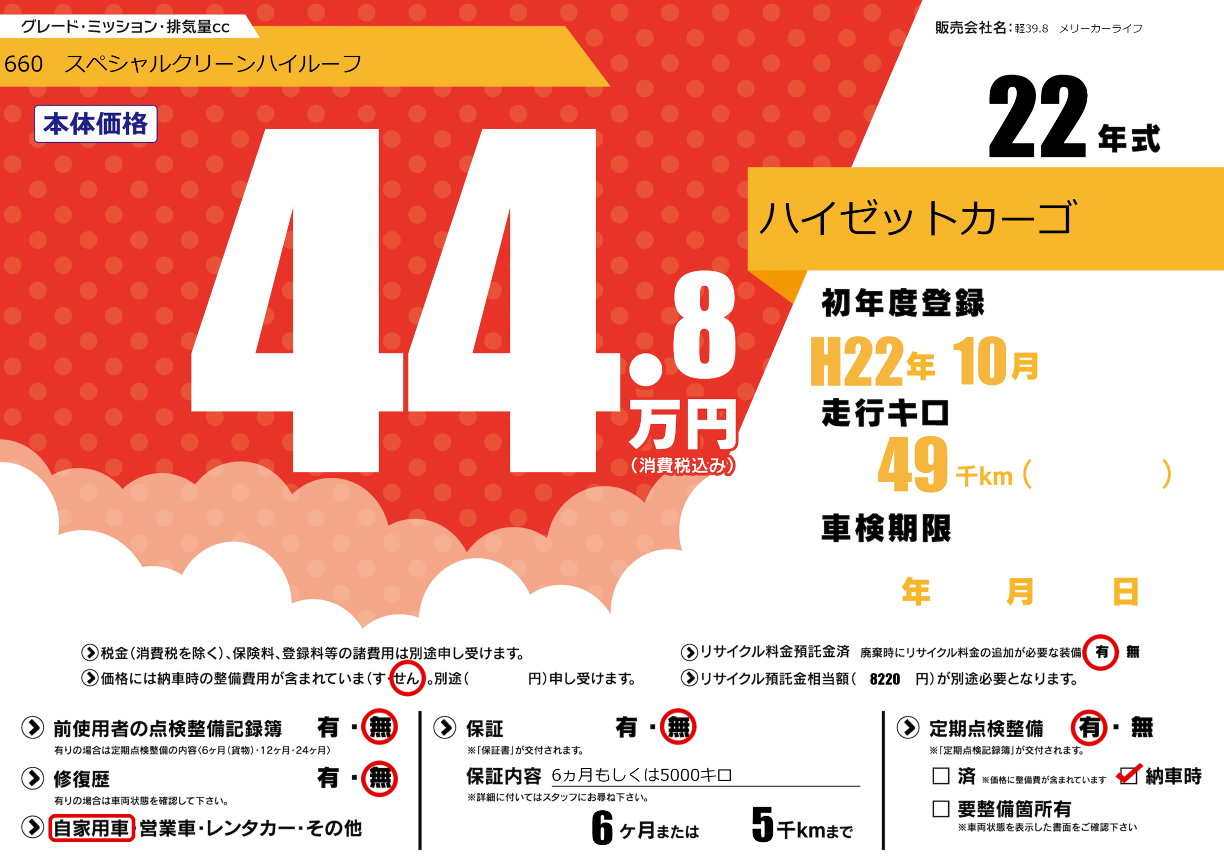 | 走行キロ | 4.9万km | 初年度登録 | H22年10月 |