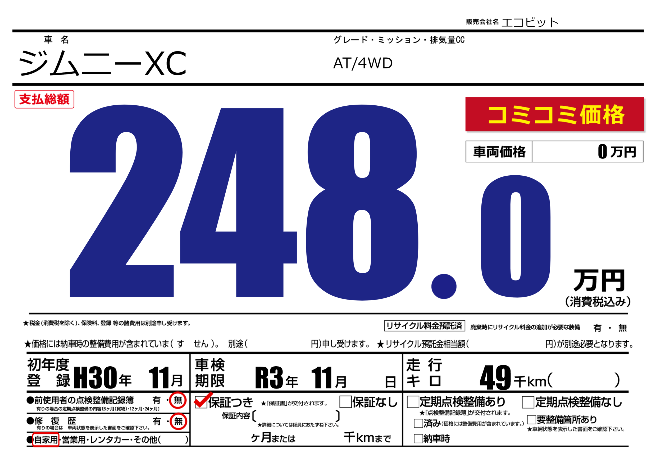 | 車検制限 | R3年 11月 - 日 | ||