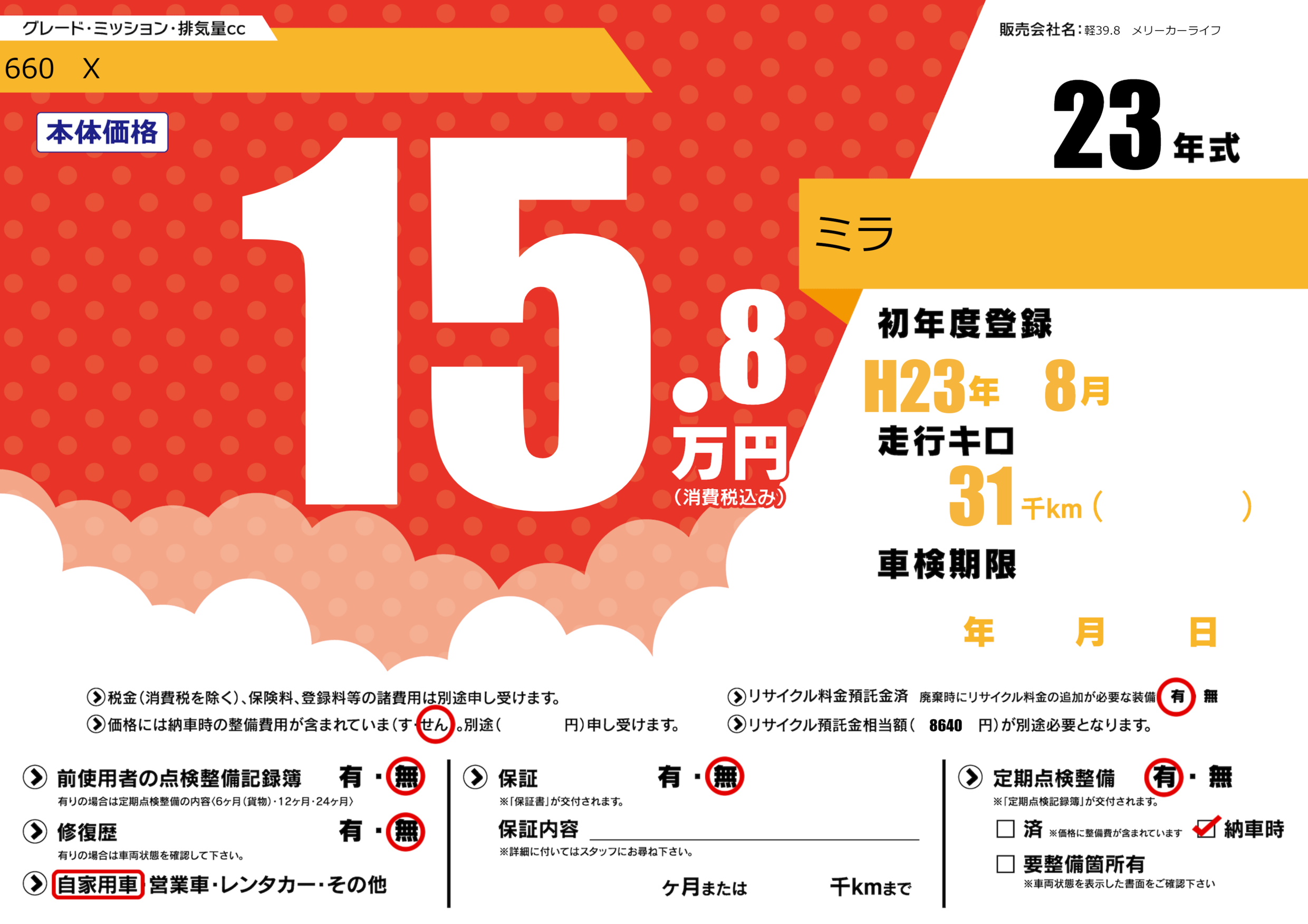 | 走行キロ | 3.1万km | 初年度登録 | H23年8月 |