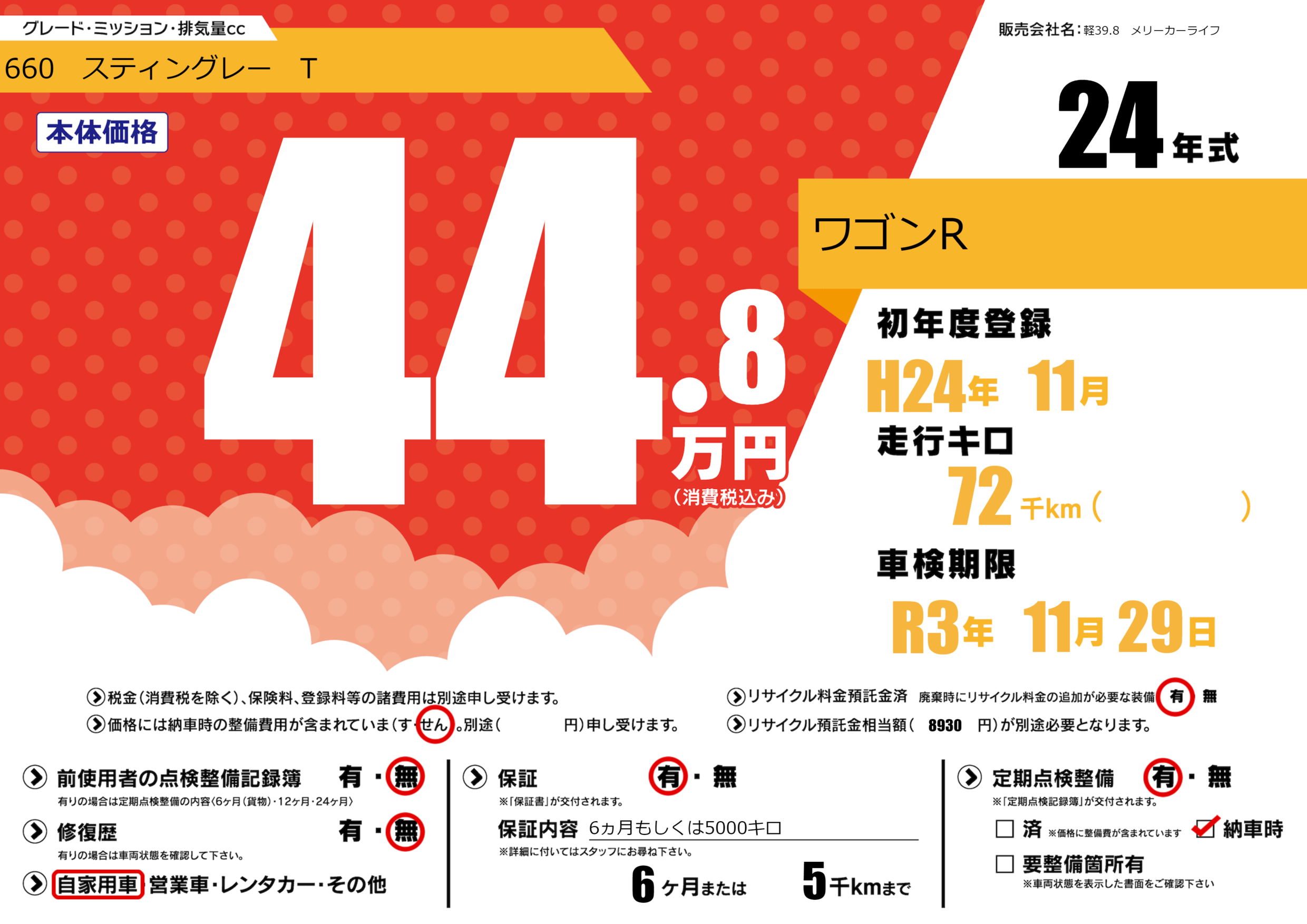 | 定期点検整備 | 定期点検整備あり 納車時あり | ||