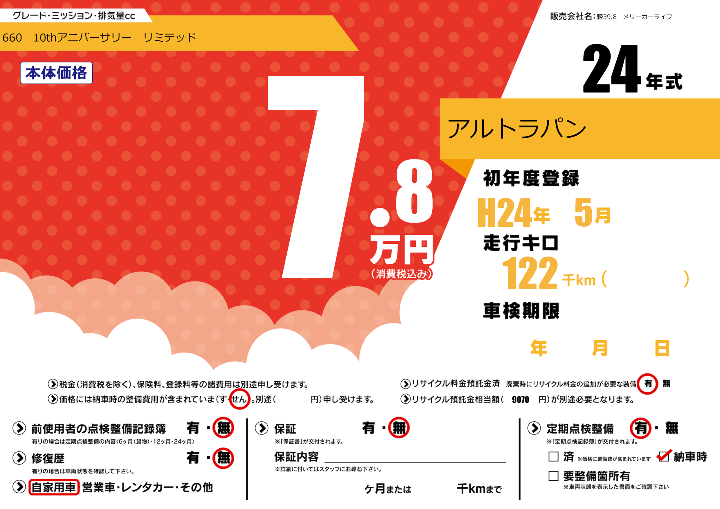 | 定期点検整備 | 定期点検整備あり 納車時あり | ||