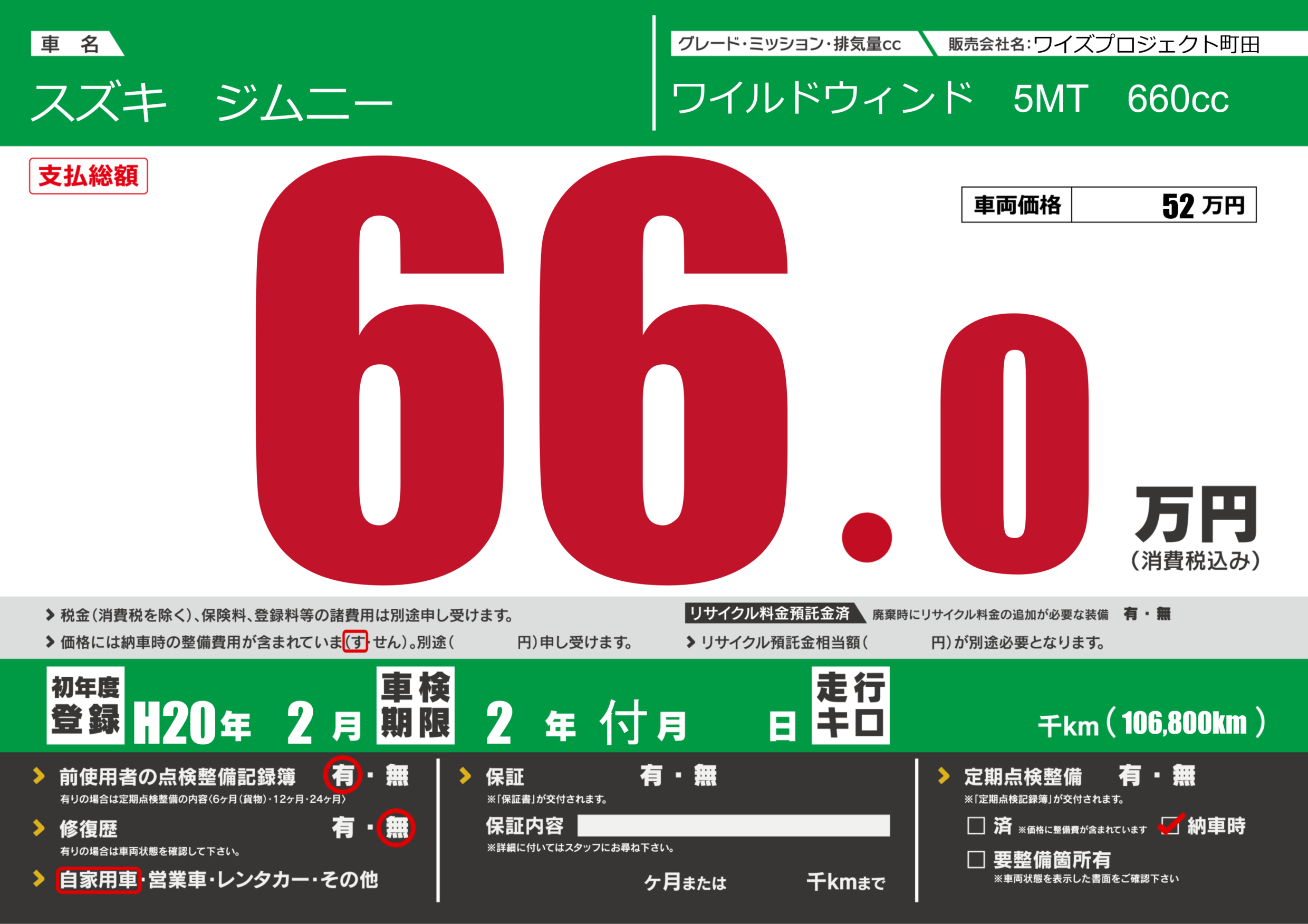 | 車名 | スズキ ジムニー | グレード ミッション 排気量 |