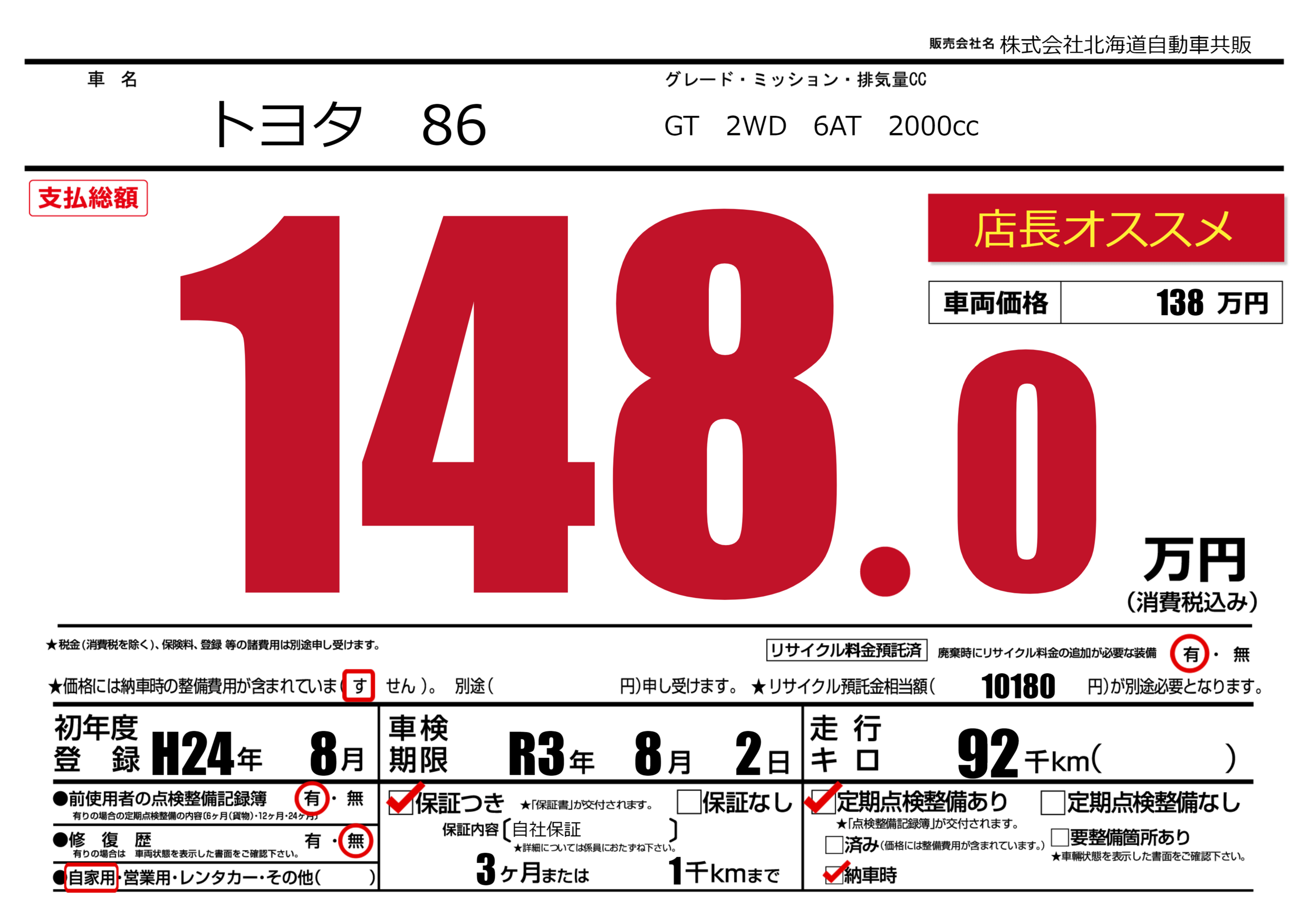 保証付き 保証内容(自社保証) 3ヶ月または(1)千kmまで |