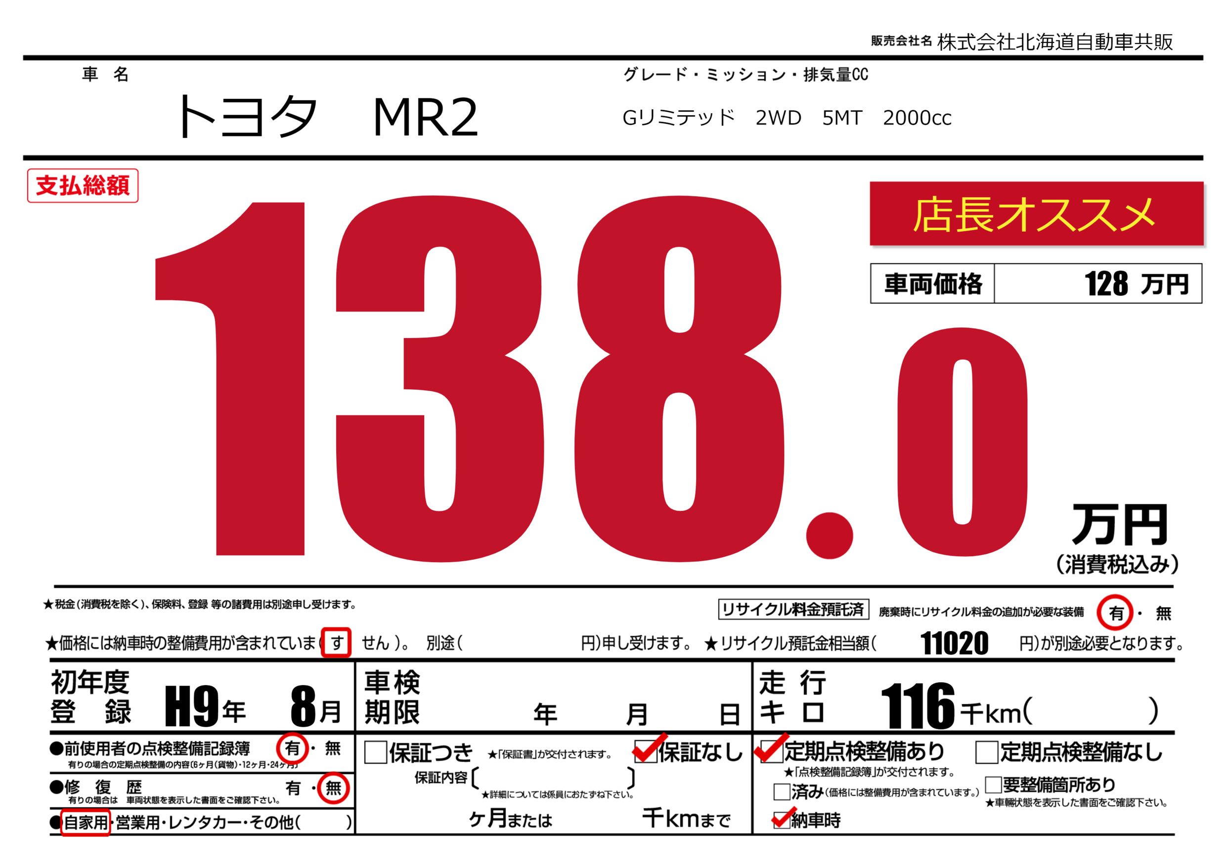 | 車名 | トヨタ MR2 | グレード ミッション 排気量 |