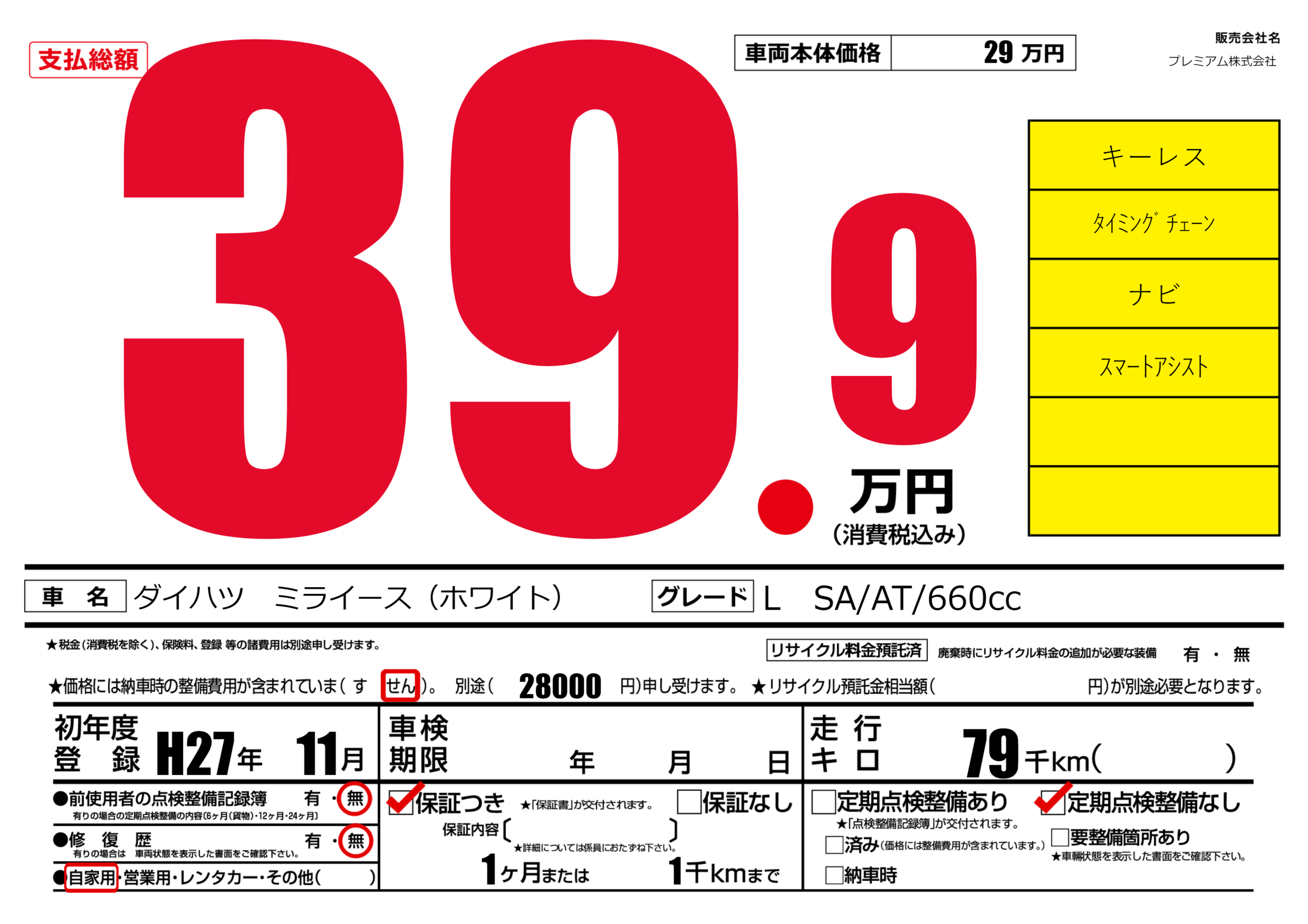 | 車名 | ダイハツ ミライース(ホワイト) | グレード ミッション 排気量 |