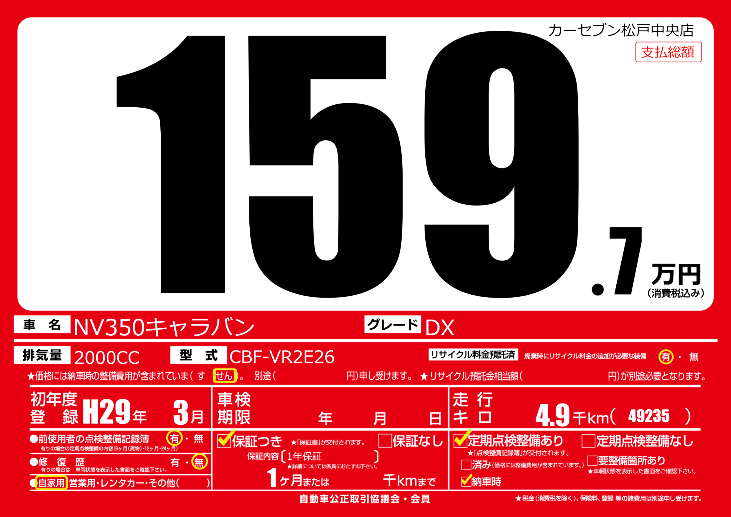 | 車名 | NV350キャラバン | グレード ミッション 排気量 |