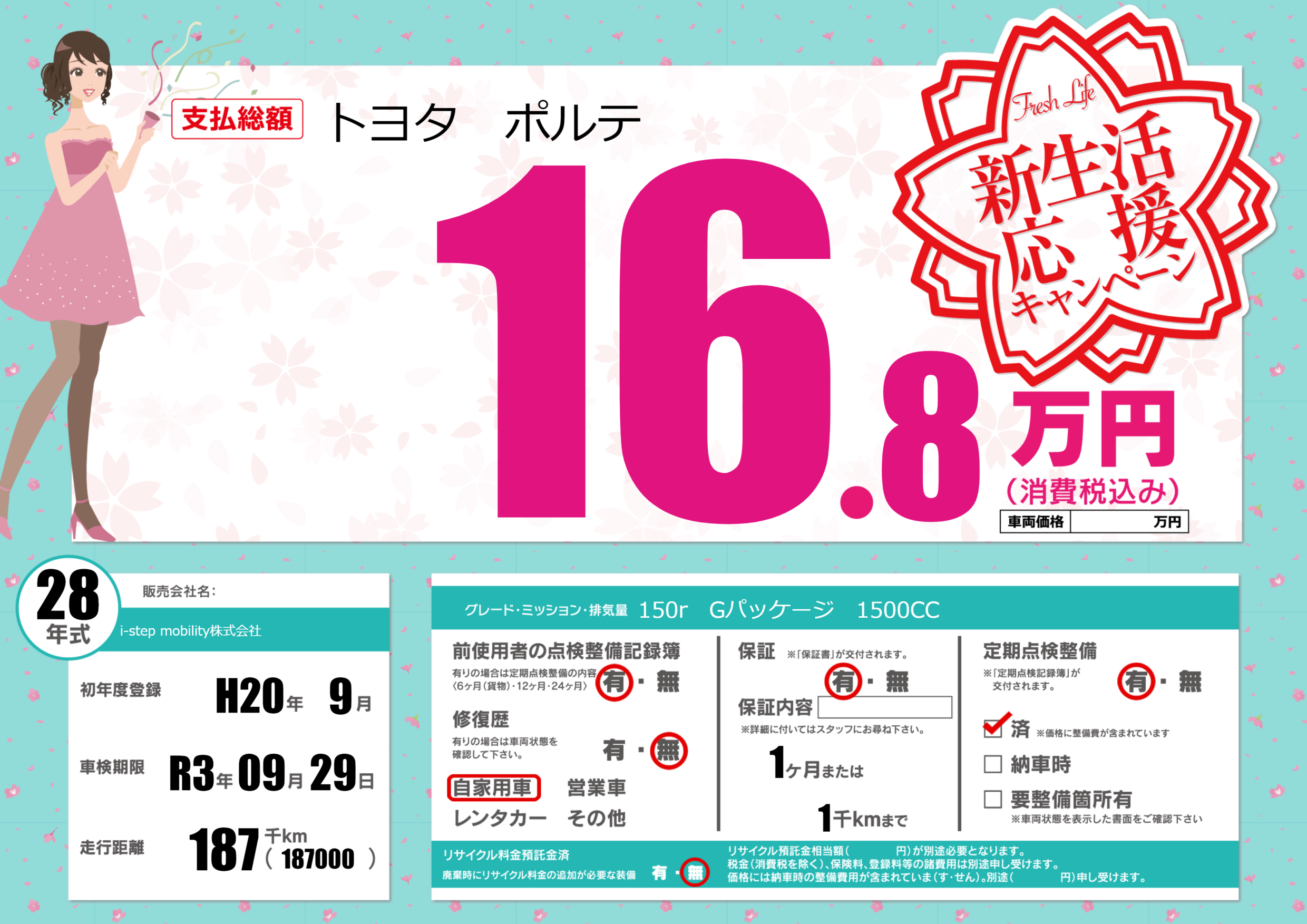 | 車名 | トヨタ ポルテ | グレード ミッション 排気量 |