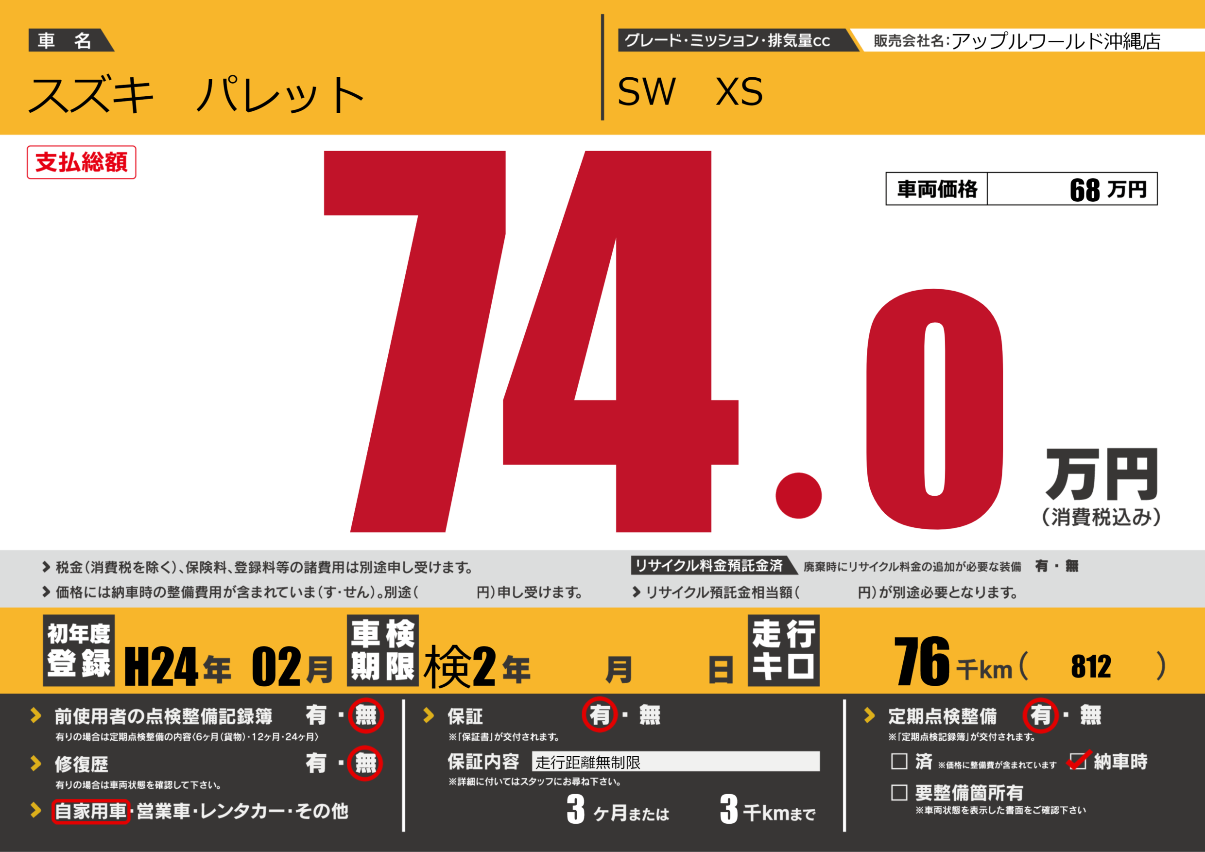 | 走行キロ | 7.6万km | 初年度登録 | H24年02月 |