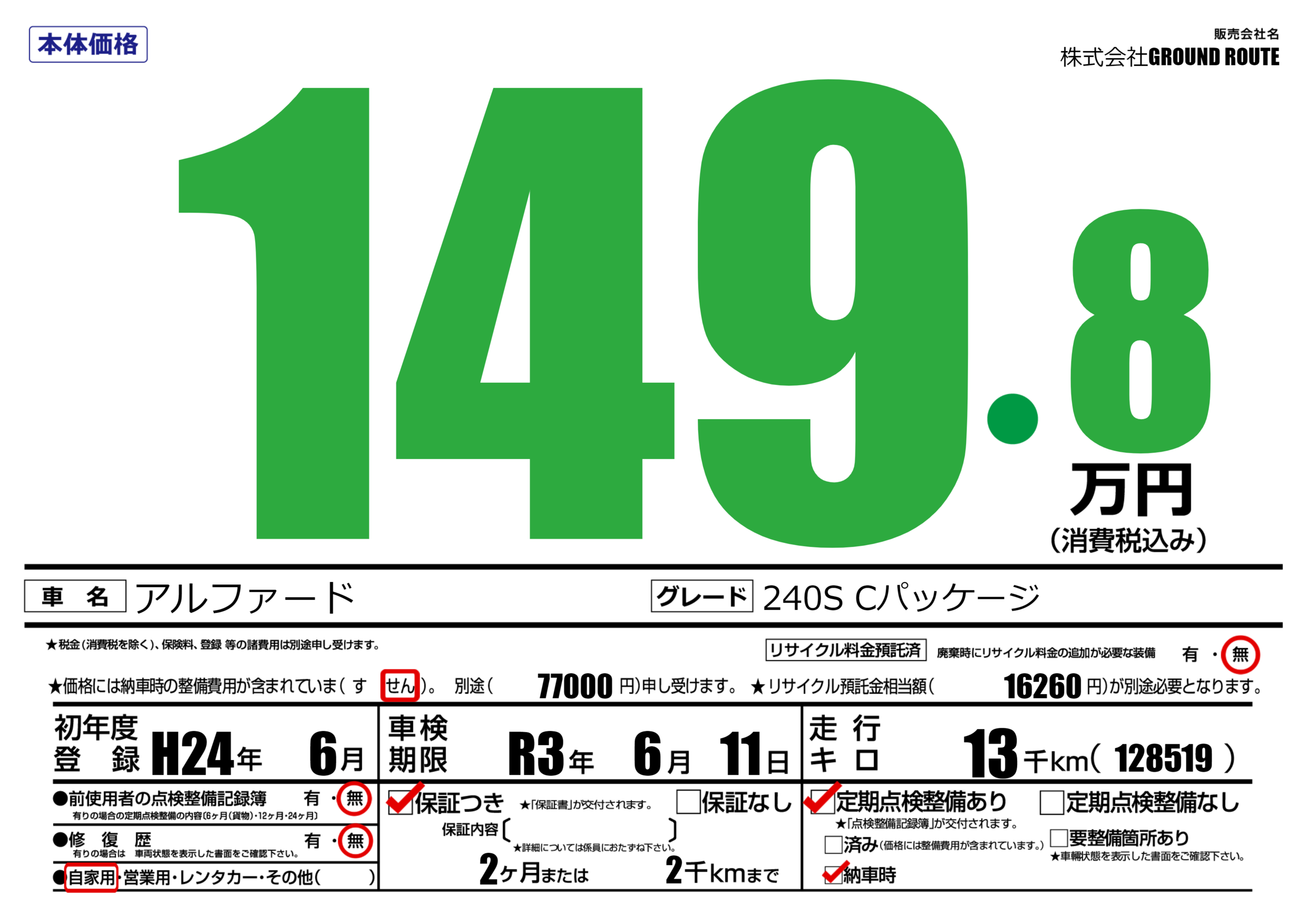| 車名 | アルファード | グレード ミッション 排気量 |