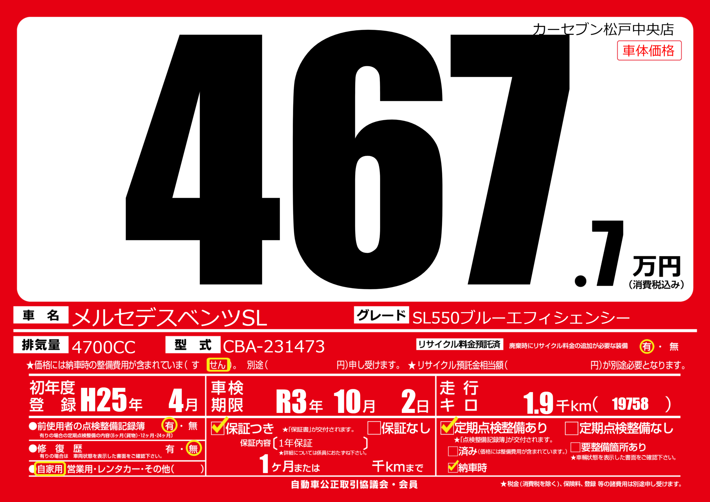 | 車名 | メルセデスベンツSL | グレード ミッション 排気量 |