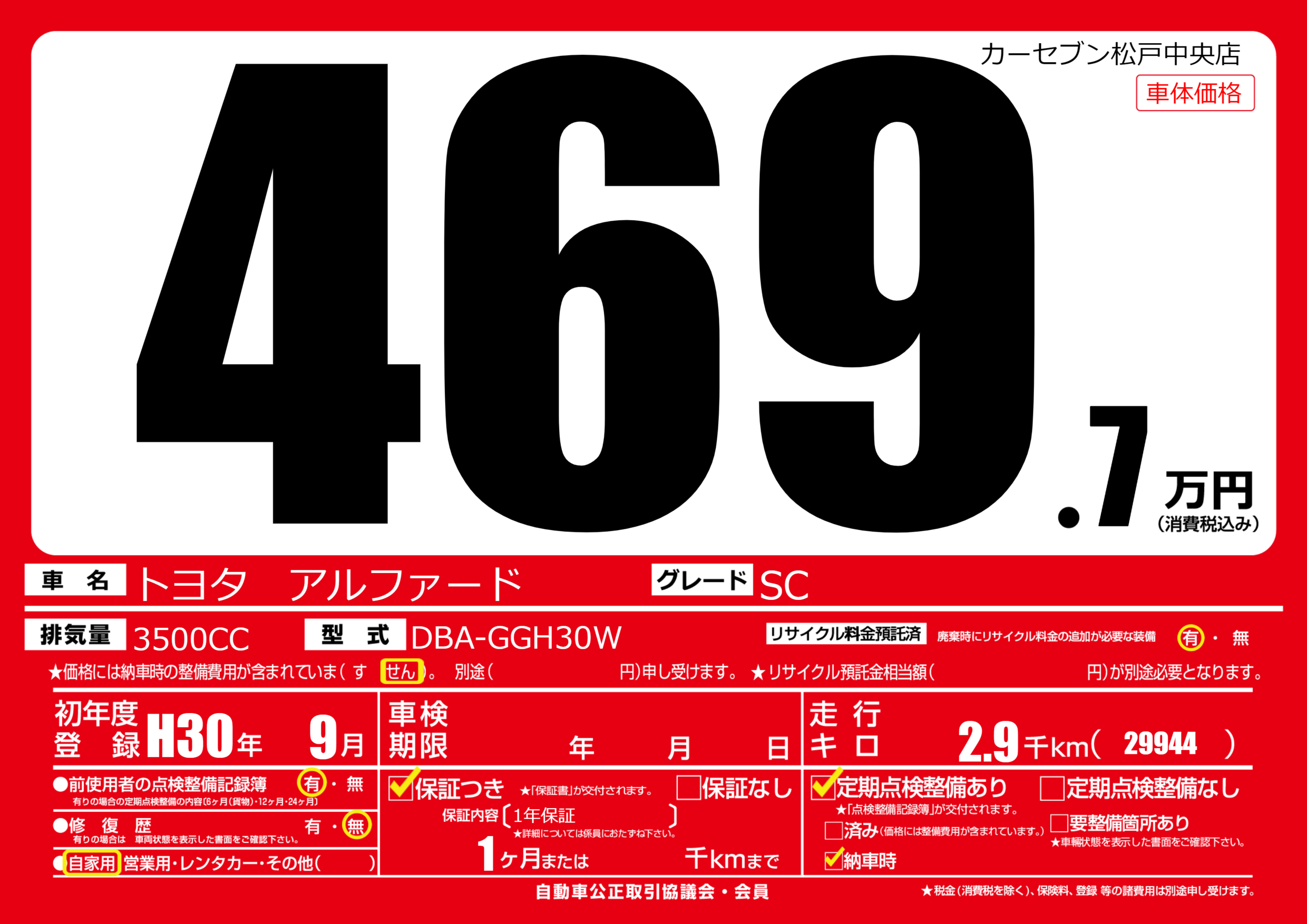 | 車名 | トヨタ アルファード | グレード ミッション 排気量 |